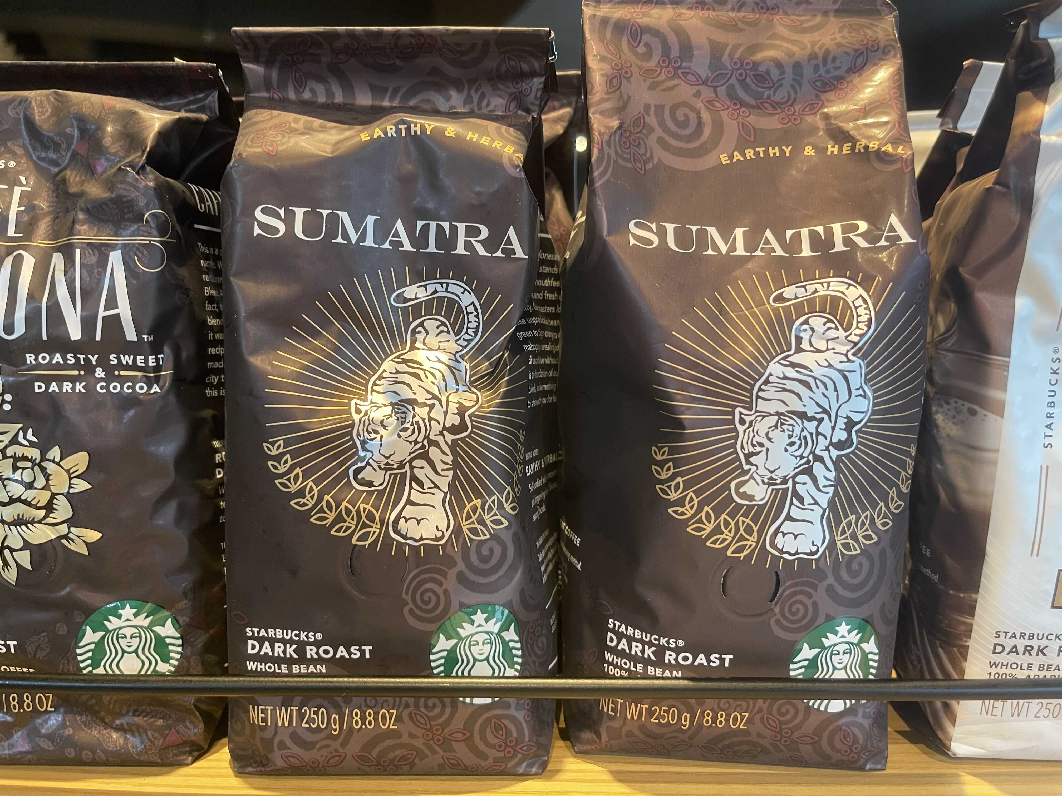 원두 패키지에 새겨진 희귀종인 수마트라 호랑이는 특유의 강한맛은 물론 대담함과 아름다움 이국적인 정취의 특징까지 상징합니다.(디자인스토리)