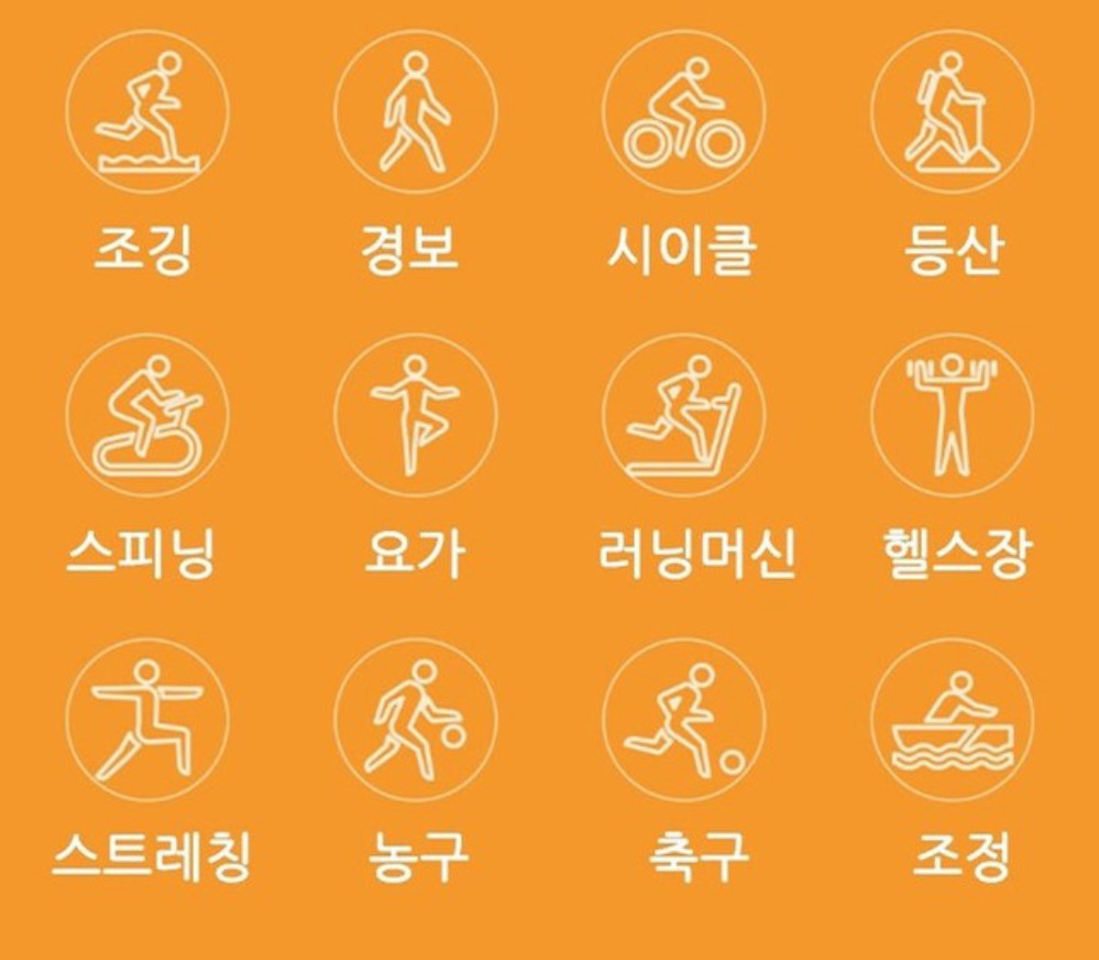 운동모드 : 달리기, 걷기, 라이딩, 등산, 스피닝, 요가, 실내러닝, 카누, 체조, 축구, 농구, 트레이닝