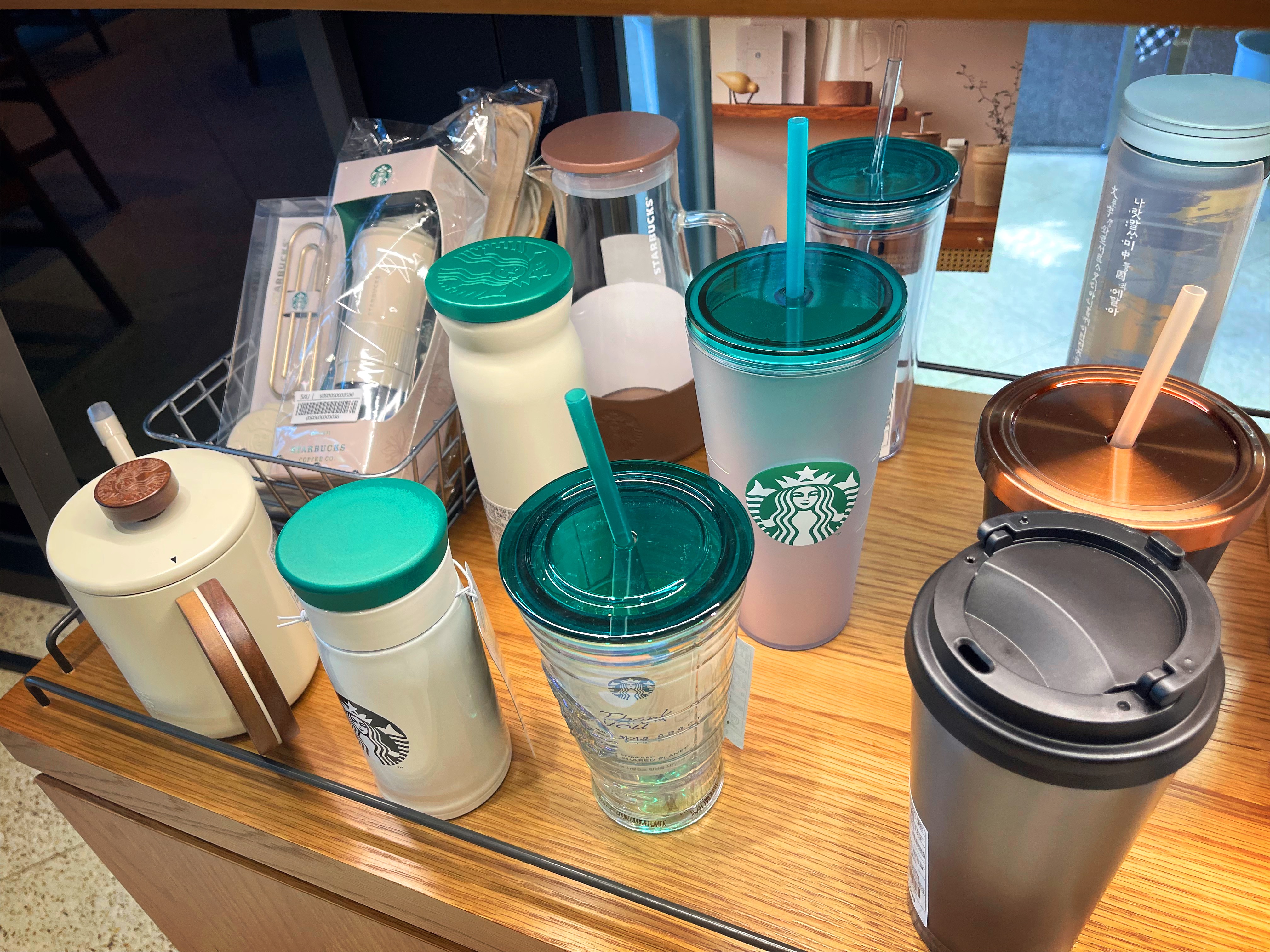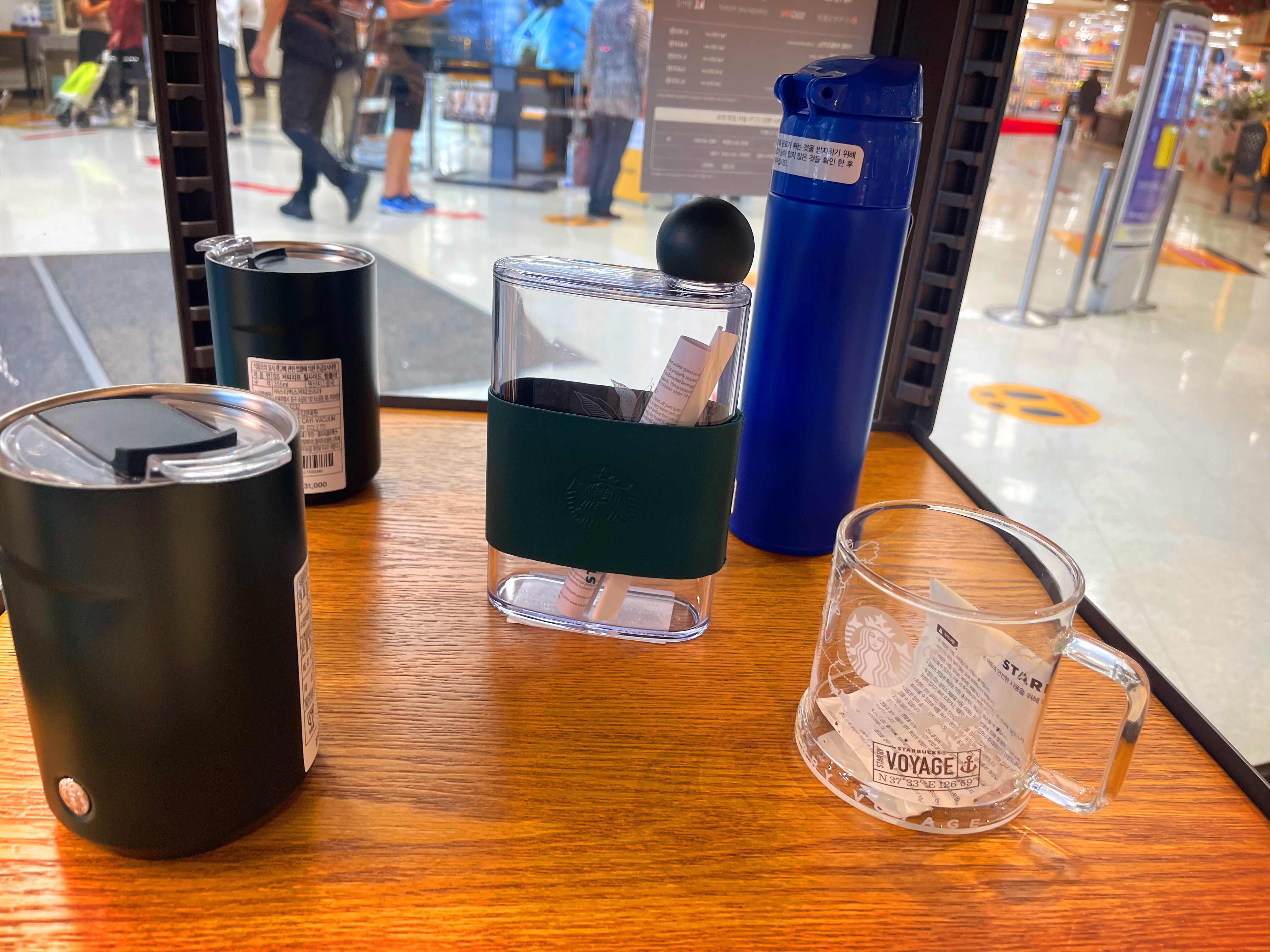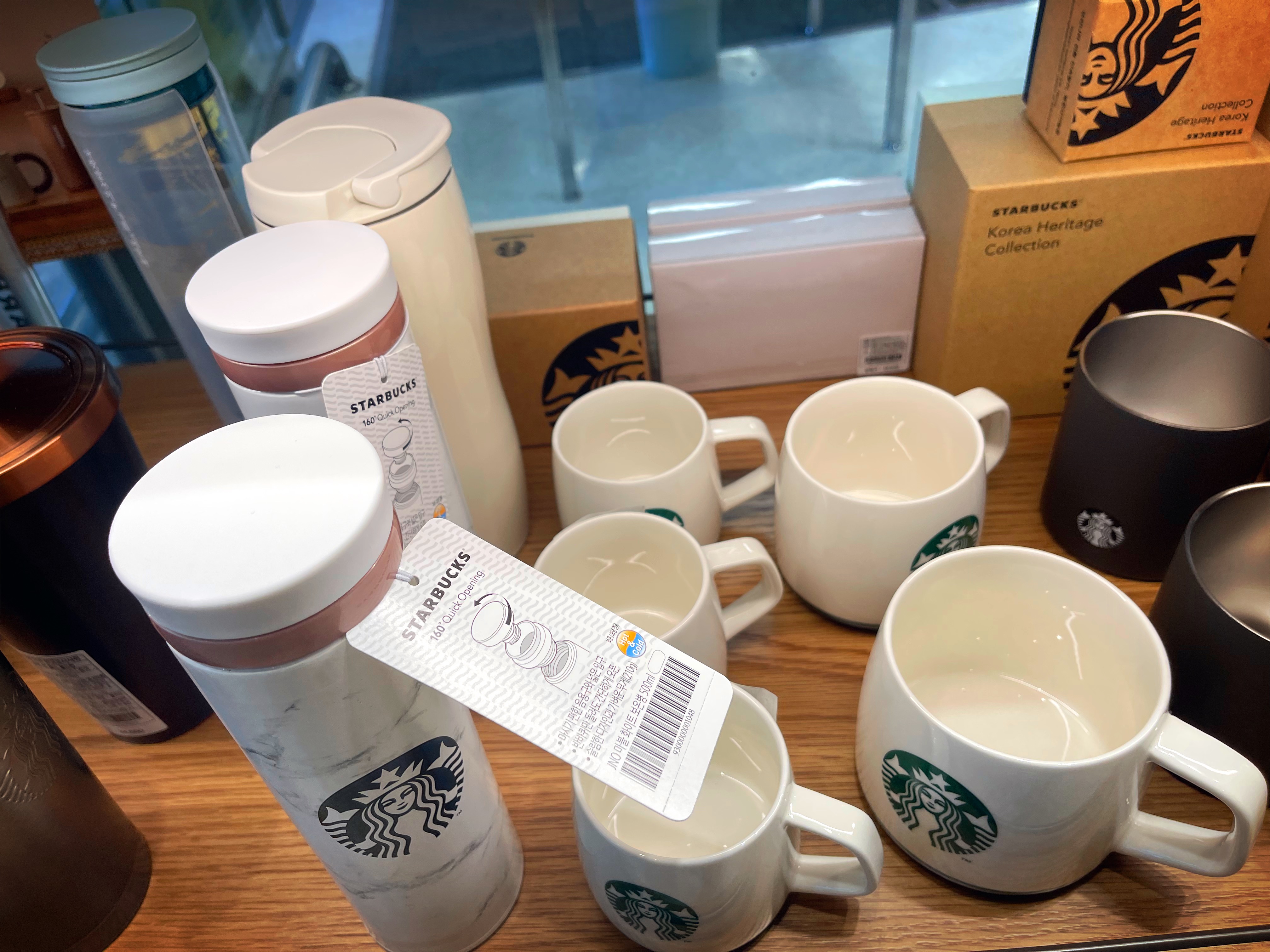 스타벅스의 다양한 텀블러와 컵들을 구경했습니다.