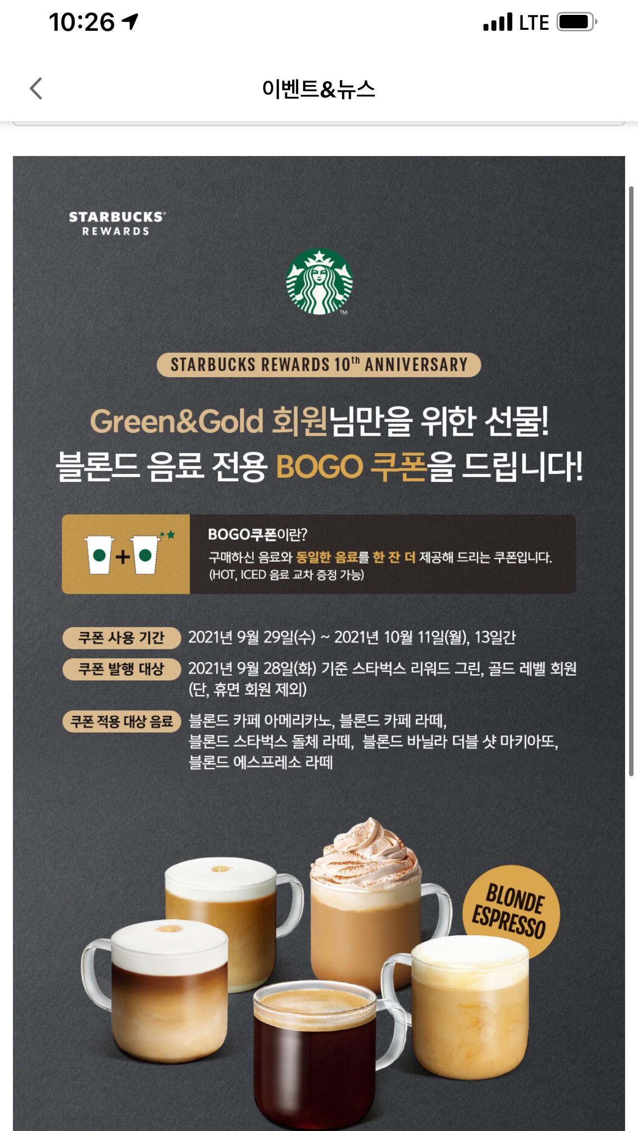 1. 해당쿠폰은 9월 28일 화요일 기준 스타벅스 리워드 그린, 골드 레벨 회우너 계정에 e쿠폰형태로 발행