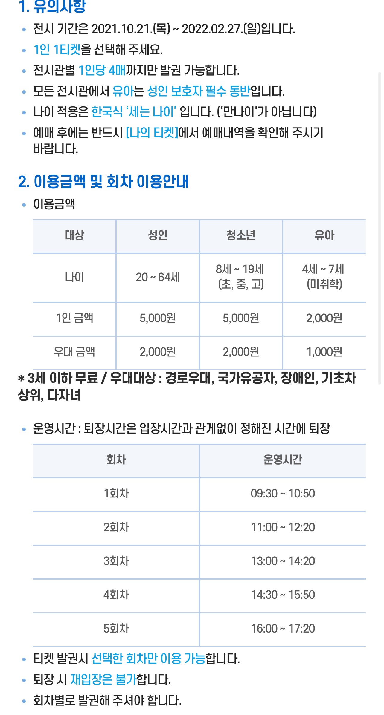 티켓발권시 선택한 회차만 이용가능 : 지각해서 퇴장시간 넘어서 도착할경우 입장 불가하며 환불도 불가