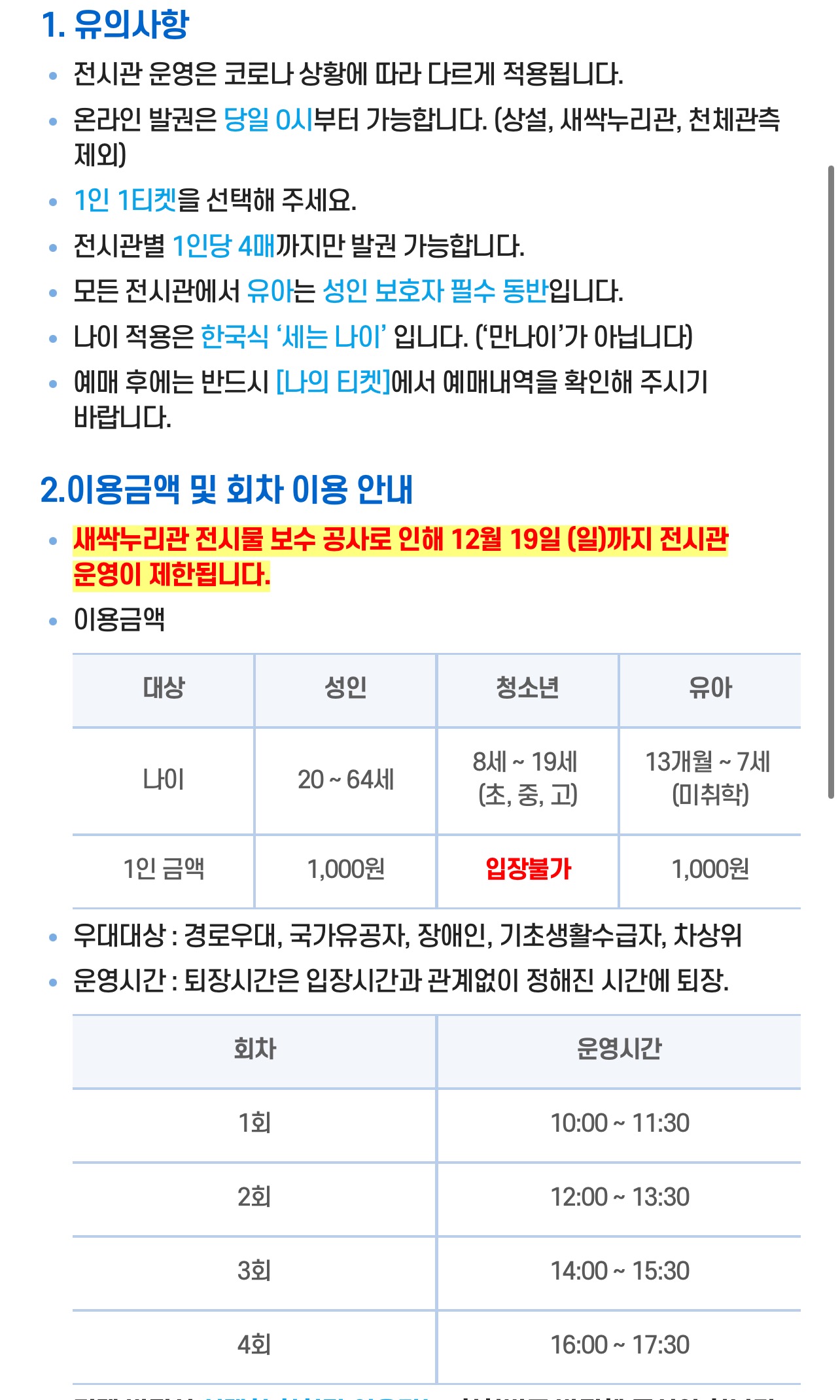 새싹누리관 전시물 보수공사로인해 2021년 12월 19일 일요일까지 전시관 운영이 제한됩니다.