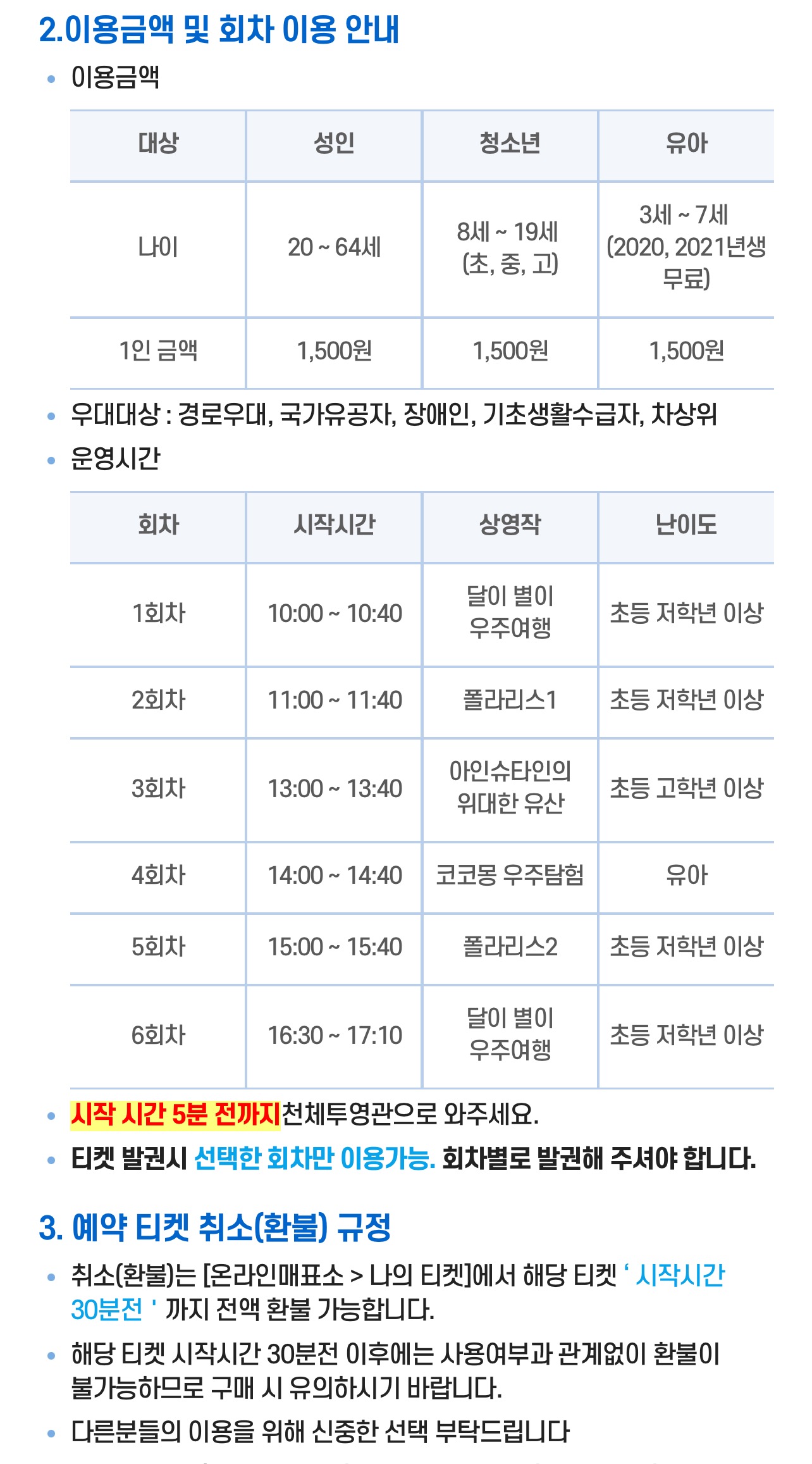 천체투영관 이용금액 및 회차별 상영 영화시간표