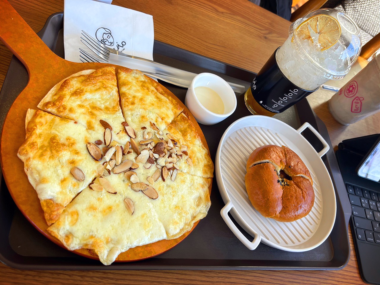 아이와 둘이서 고르곤졸라 또띠아 피자와 단팥빵 그리고 에이드한잔