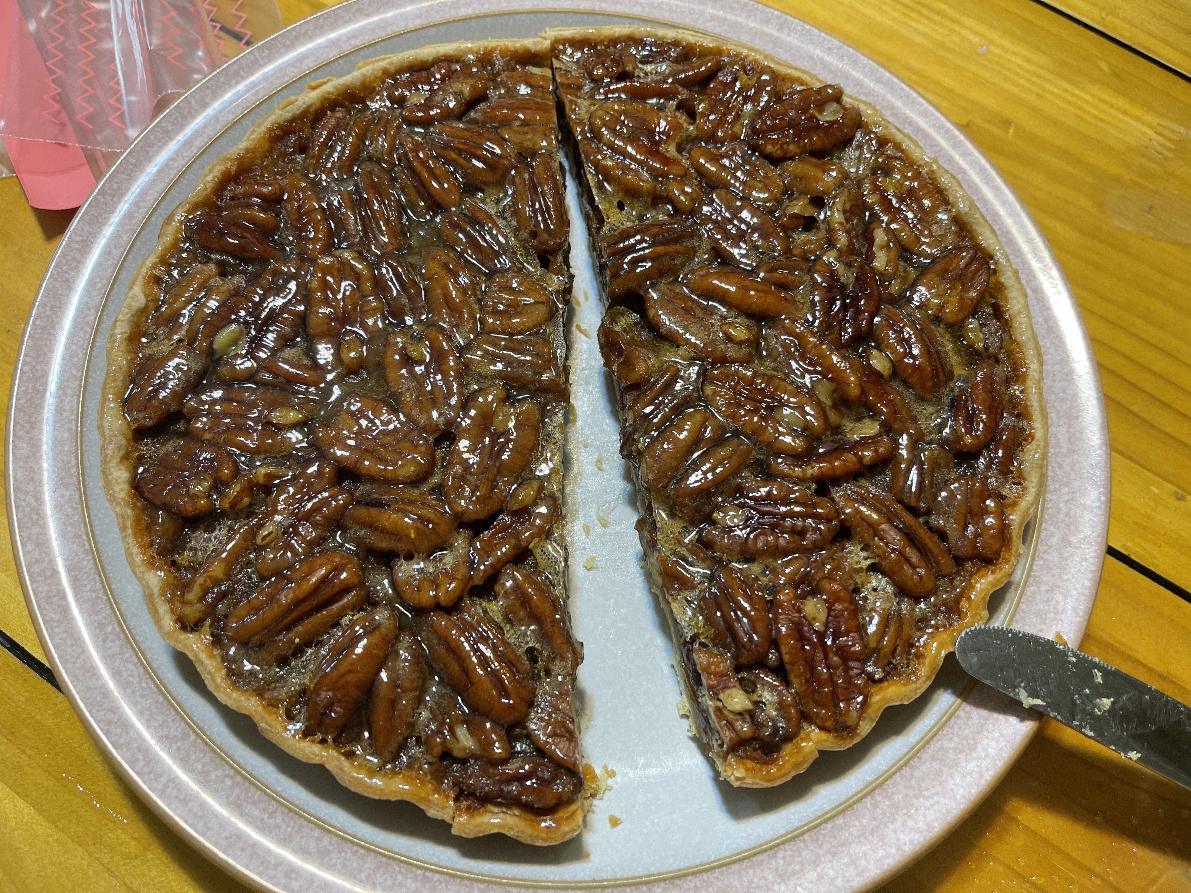 제가 가진 나이프(과도아님)로 잘랐는데, 아주 깔끔하게 잘 잘렸습니다. 단면을 보고싶었기도했고, 보관도 잘라서 하려구요. 저만큼 피칸파이를 좋아하는 사람도 없는데,.... 뭐 혼자 먹죠 뭐.... ㅋㅋㅋㅋ (제주변에는 다들 견과류를 싫어하는 느낌)