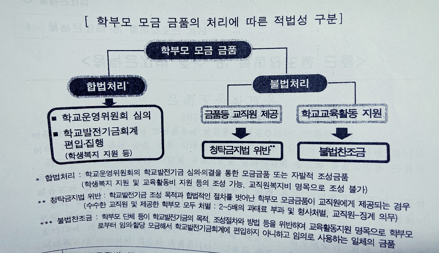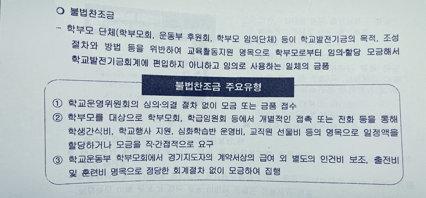 학부모 단체 (학부모회, 운동부 후원회, 학부모 임의단체) 등이 학교 발전기금의 목적, 조성절차와 방법등을 위반하여 교육활동지원 명목으로 학부모로부터 임의 할당 모금해서 학교발전기금회계에 편입하지 아니하고 임의로 사용하는 일체의 금품