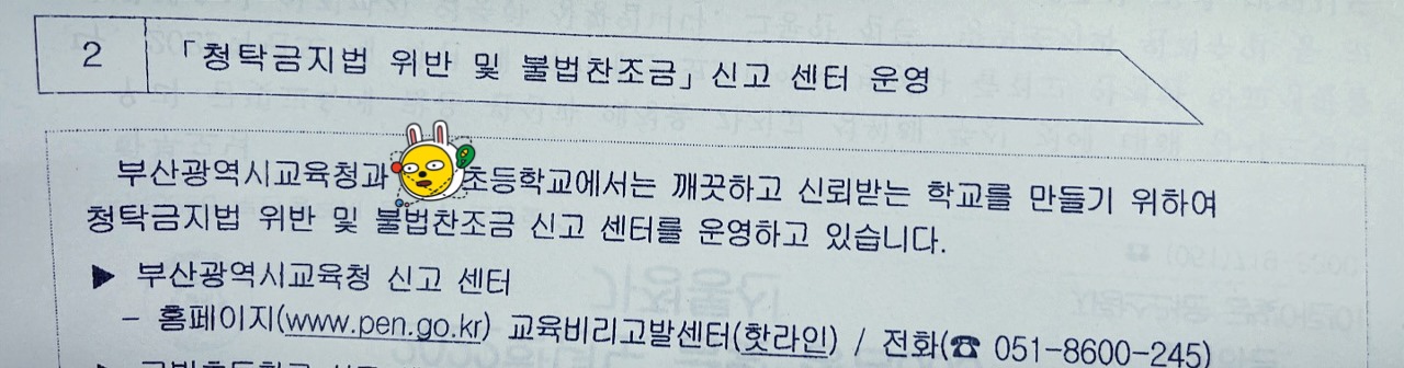 부산광역시교육청과 초등학교에서는 깨끗하고 신뢰받는 학교를 만들기 위하여 청탁금지법 위반 및 불법찬조금 신고센터를 운영하고있습니다.