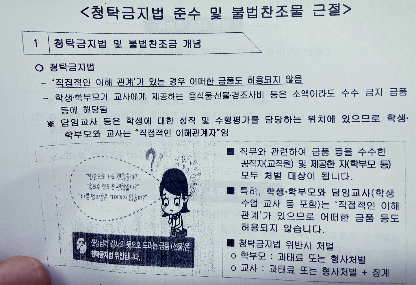 선생님께 감사의 뜻으로 드리는 금품(선물) 청탁금지법 위반입니다!!