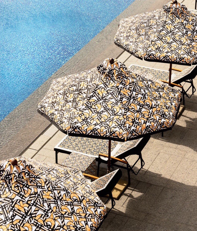 버버리가 최근 론칭한 TB 섬머 모노그램 캡슐 컬렉션 기념, 수영장에서 라운지까지 컬렉션 패턴 전시