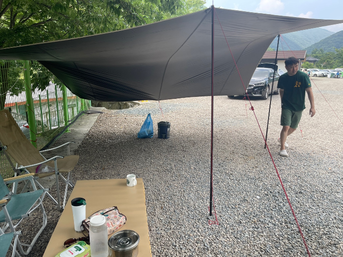 모든 아빠들이 좋아하는 캠핑장, 아이들이 좋아하는 수영장에서 실컷놀고 밥먹고 분위기 바꿔서 계곡 이용하고 또고기구워 라면먹고 또 놀고 잘먹고 잘노는 코스입니다. 그런 여러가지면에서 만족스러웠다면서 칭찬을 합니다. 42번 사이트는 그늘이 져서 타프가 필요 없었는데 말입니다. 남편은 또 열심 타프치기 연습을 하셨습니다. 42번 사이트의 단점!! 전기가 멀어서 남의집서 땡겨오는데, 다같이 6만원씩 내고 이용하는것은 같은데 뭔가 빌리는 느낌이 들어서 좀 그랬습니다. 마니멀어요. 41번도 40번에서 땡겨와야 한다면 말다했습니다.
