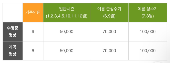 계곡이 있고, 수영장이 있고, 캠핑장이 있고 텐트는 6만원 기준인원 4인, 캠핑카는 7만원 기준인원4인 ( 캠핑이 싫으면 평상예약은 10만원이지만 기준인원이 6명) 평상 이용 시간 : 오전 10시~ 오후6시 총 8시간 예약시 시스템 문제로 1박을 적용하여 예약하지만 평상은 1박이 아닙니다.