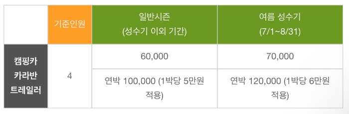 캠핑카 카라반 트레일러는 7만원입니다. 기준인원 4인(연박시 12만원 / 3박시 18만원 : 1박당 6만원 적용)