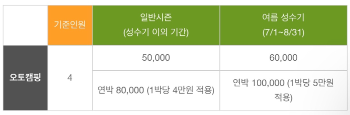 오토캠핑 6만원입니다. 기준인원 4인 (연박시 10만원 / 3박시 15만원 : 1박당 5만원 적용)
