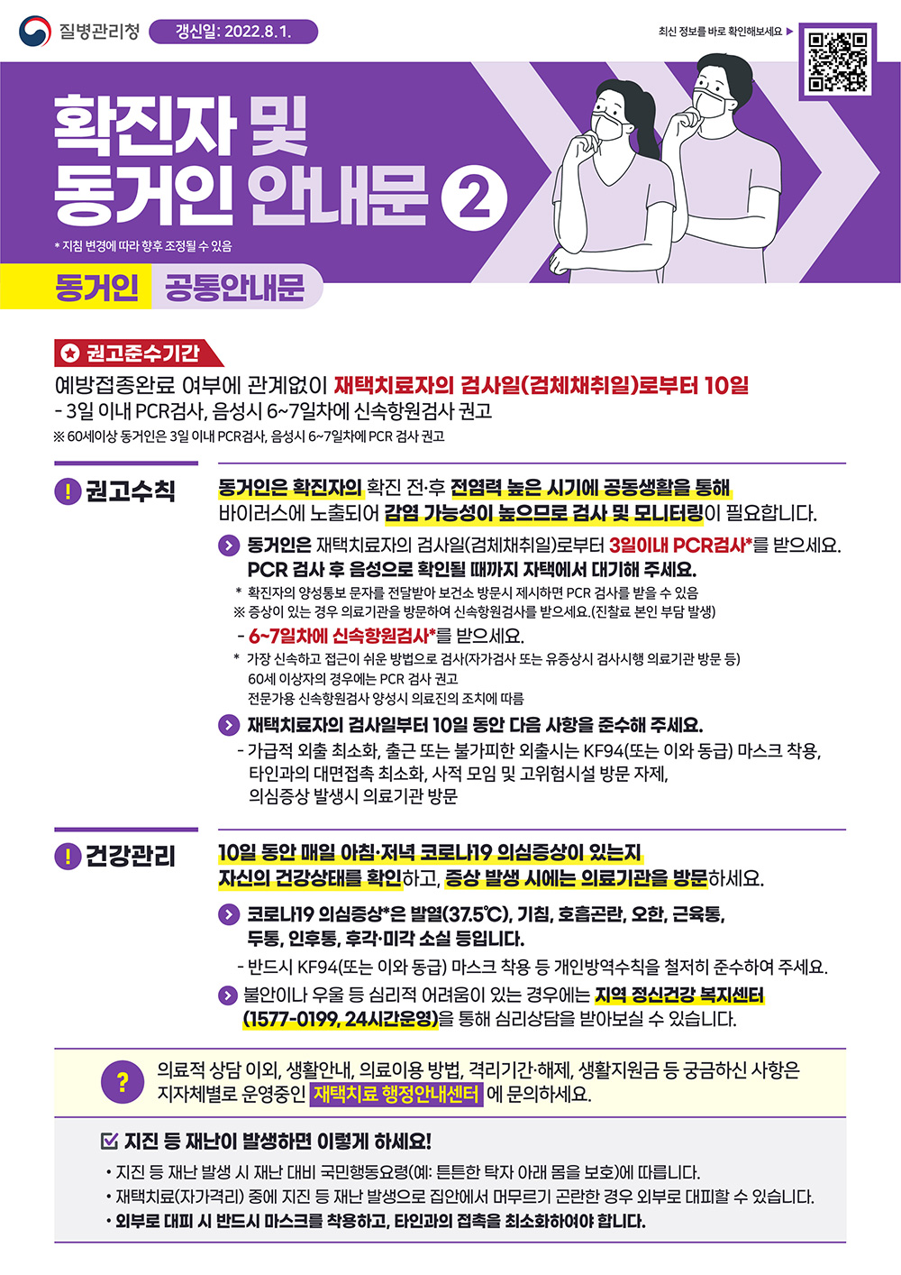 권고수칙 : 동거인은 확진자의 확진 전후 전염력이 높은 시기에 공동생활을 통해 바이러스에 노출되어 감염가능성이 높으므로 검사 및 모니터링이 필요합니다.