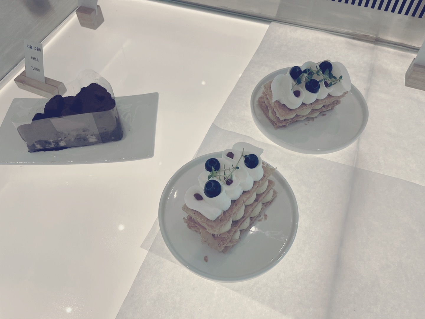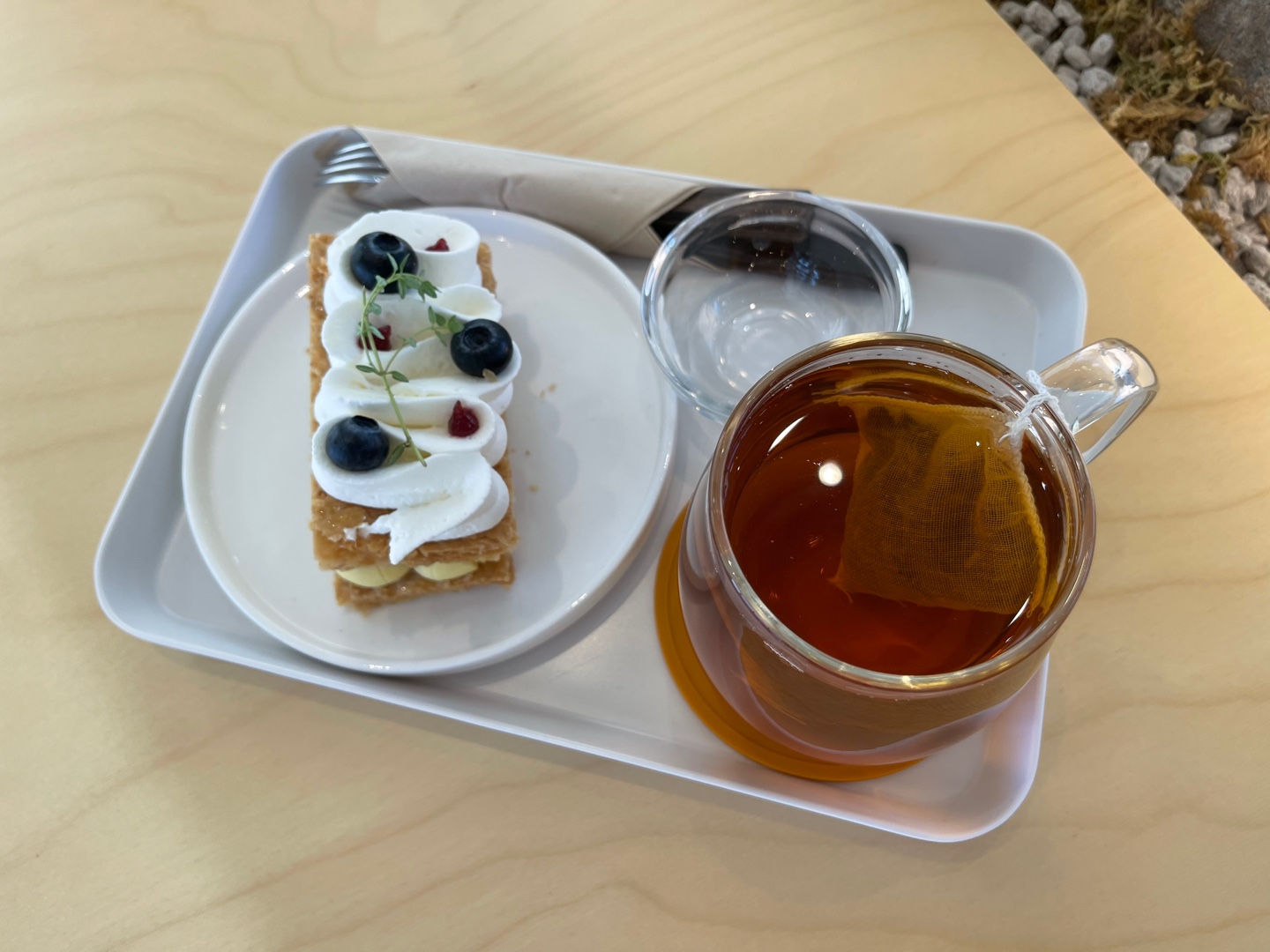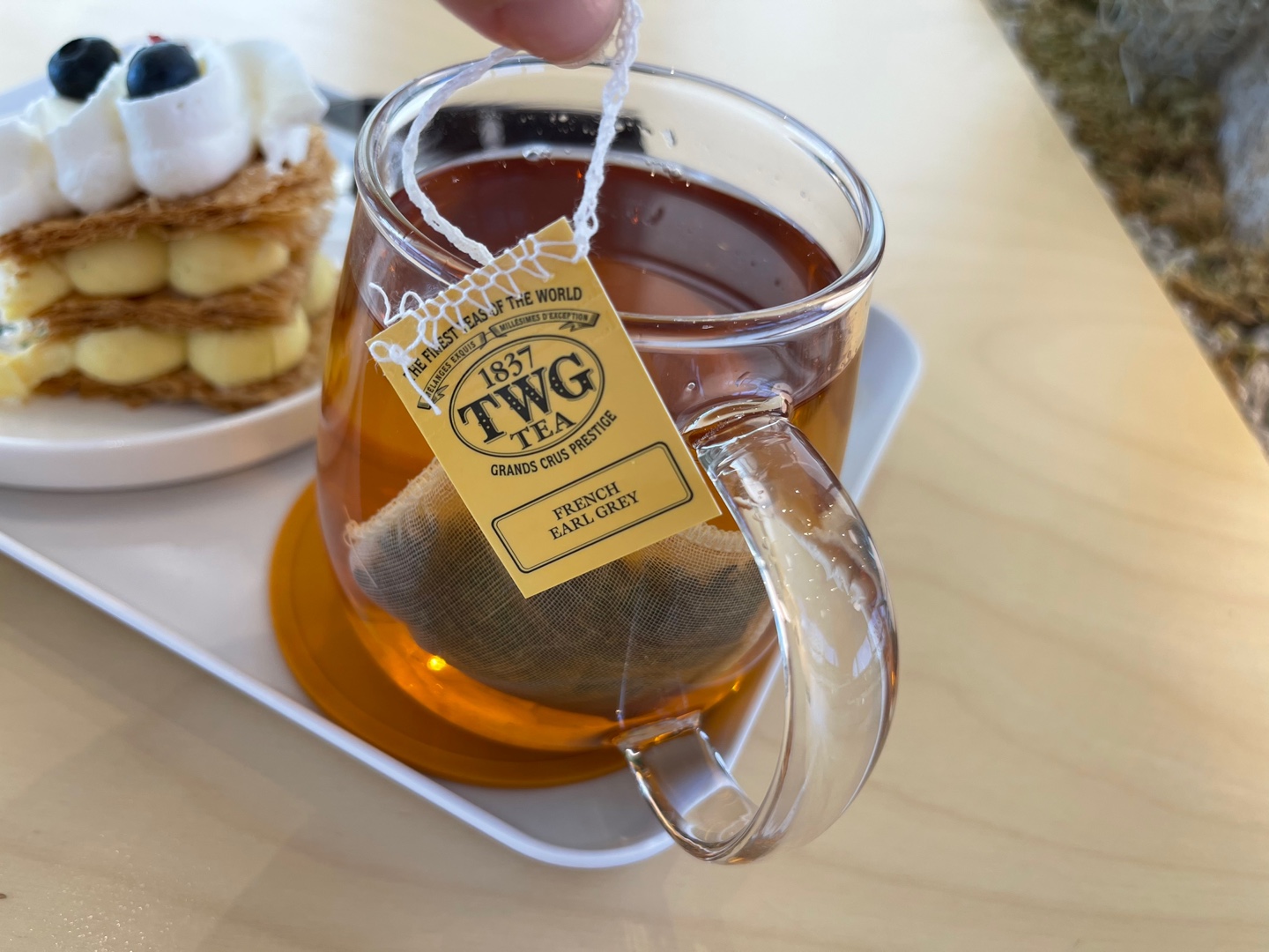 1837 TWG 티백이 당당하게 걸쳐 나오는데, 이순간 시간이 이대로 멈춰서 여기 앉아서 푸욱 쉬며 앉아있고 싶다는 생각 이들었습니다. 가족들에게서 잠시 떨어져서 들어온 이 카페에서 그냥 밀푀유를 주문하고 또 오늘은 오전에 커피를 마셨으니 티를 선택한 것이었는데,
