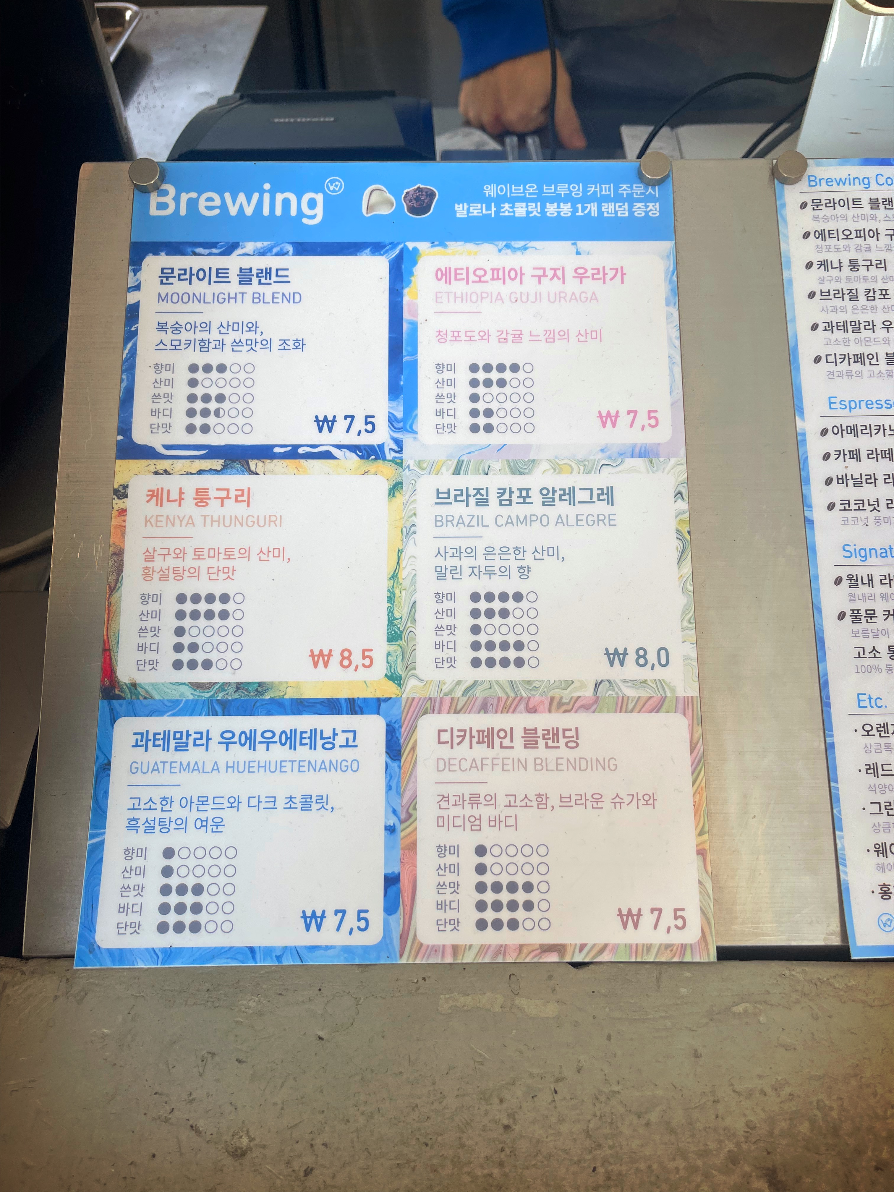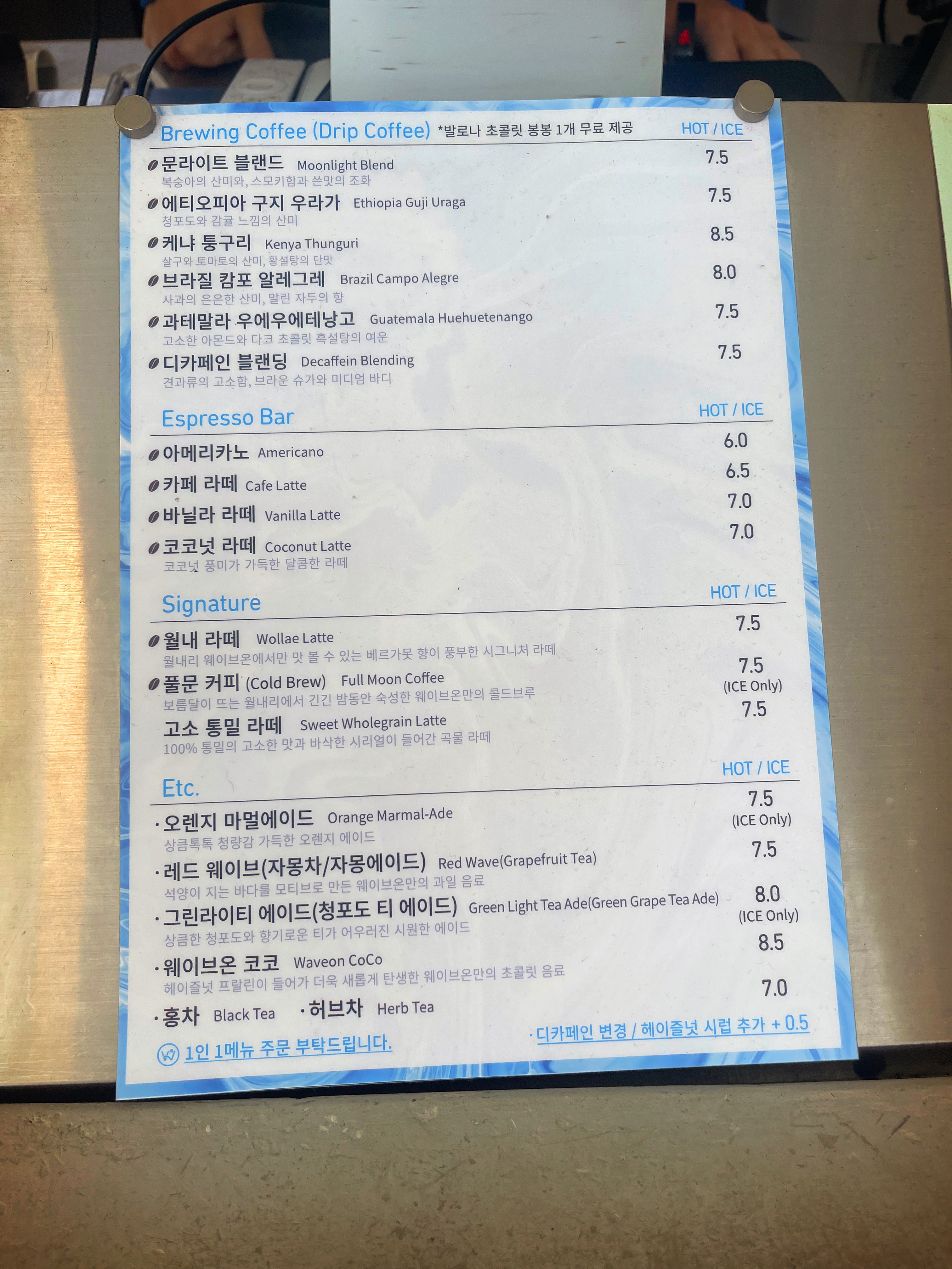 웨이브온 커피 메뉴