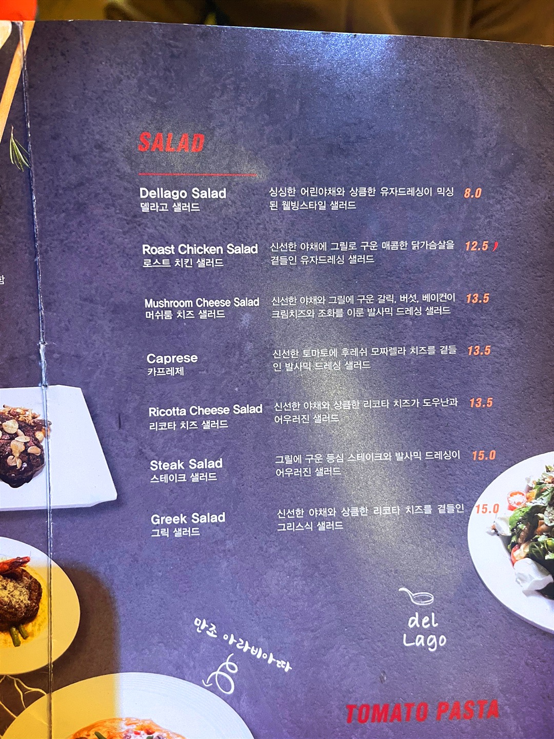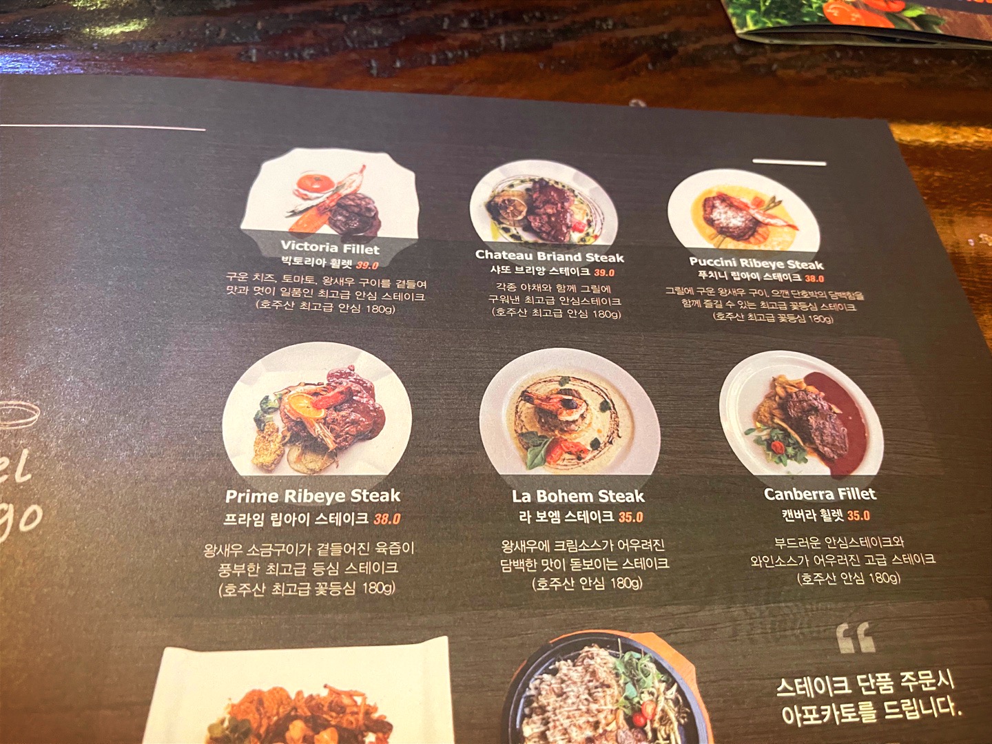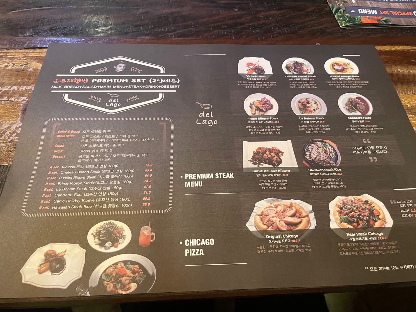 저는 피자를 좋아하는데, 남편이 앉아서 메뉴 보자마자 “오늘 피자는 먹지 맙시다” 늘 피자를 남기니까, 저혼자 다먹을 수가 없으니까 남겼는데 델라고 피자도 못먹고 가다니… 대신 스테이크를 선택했습니다.