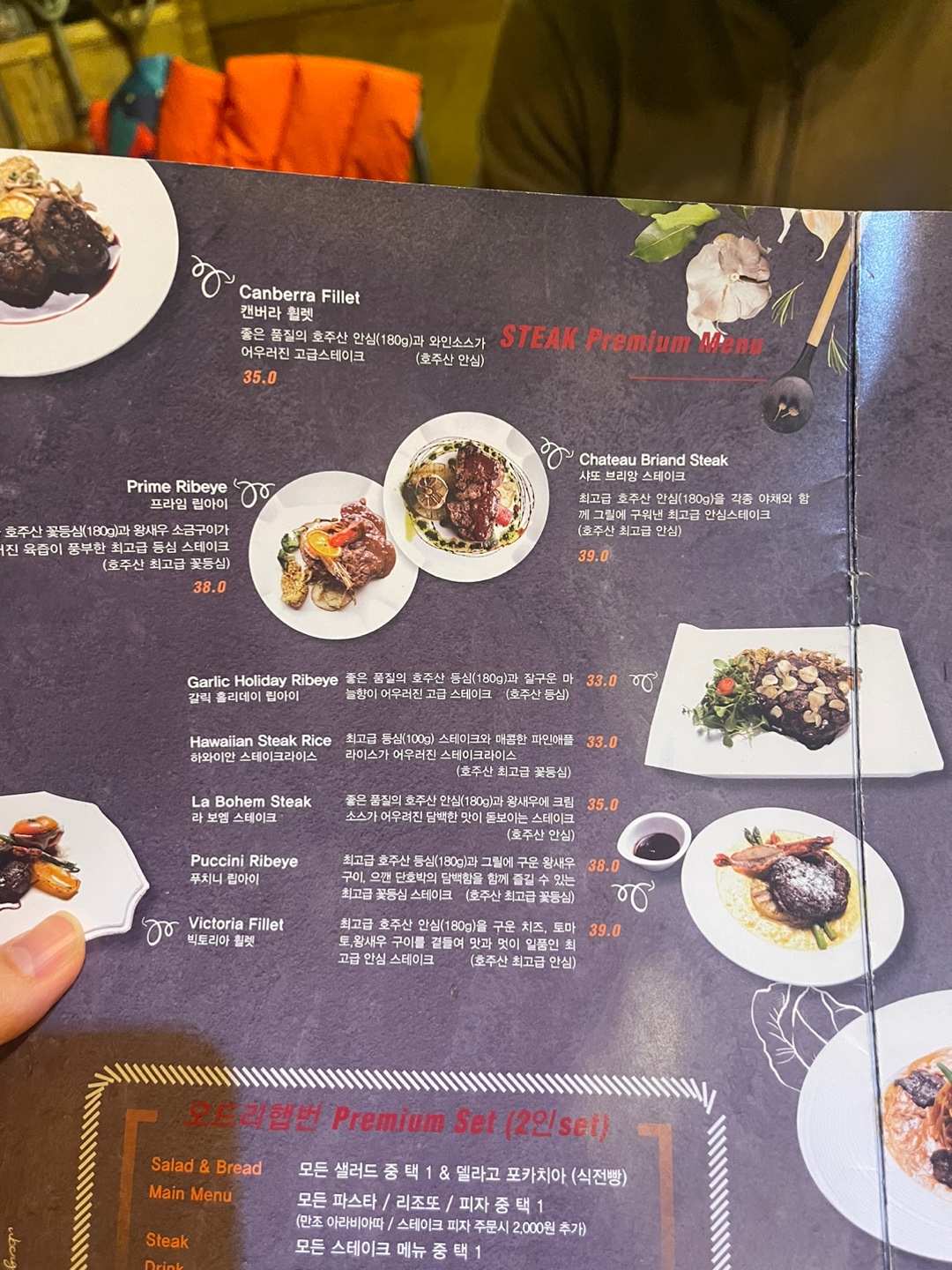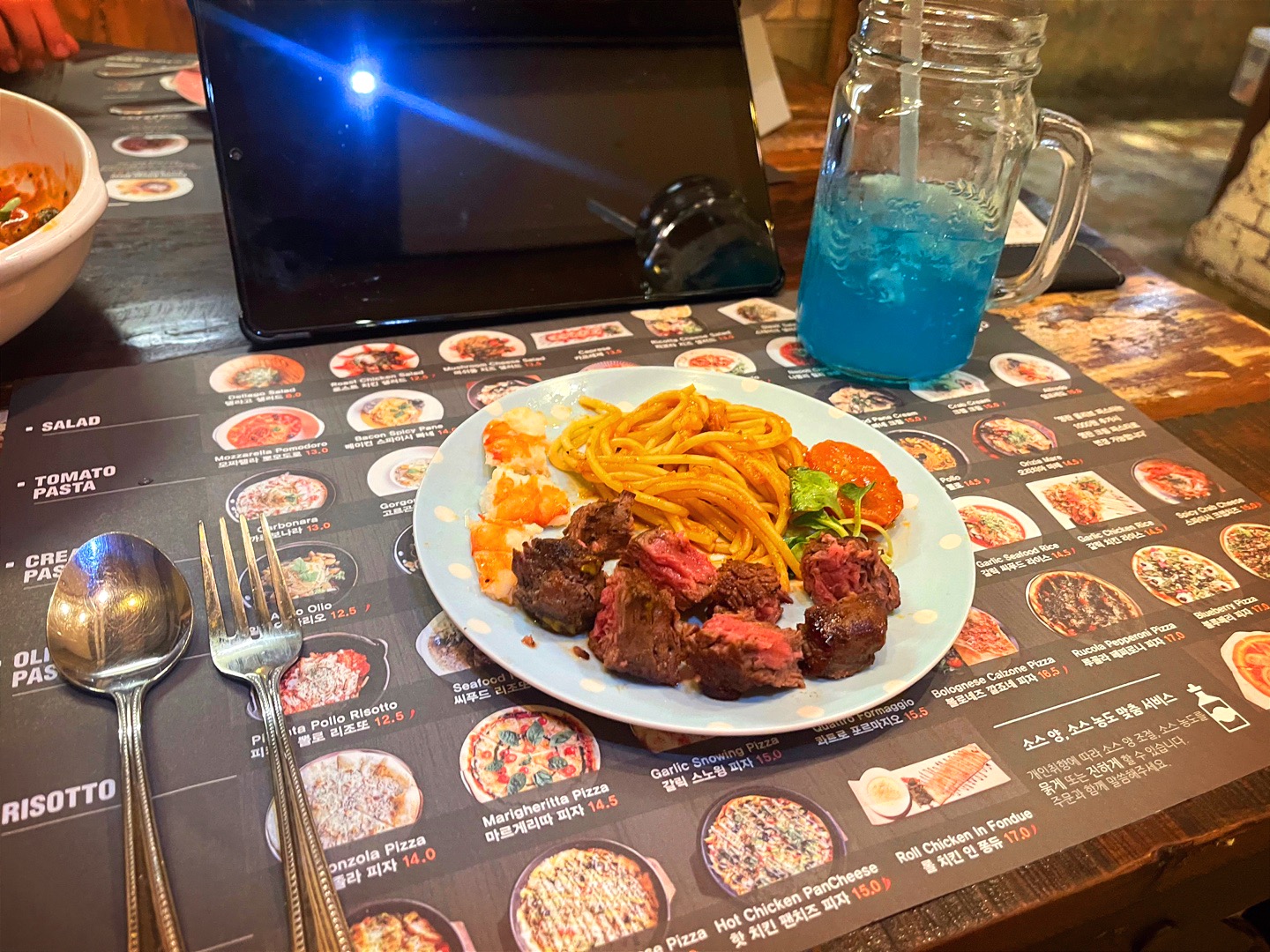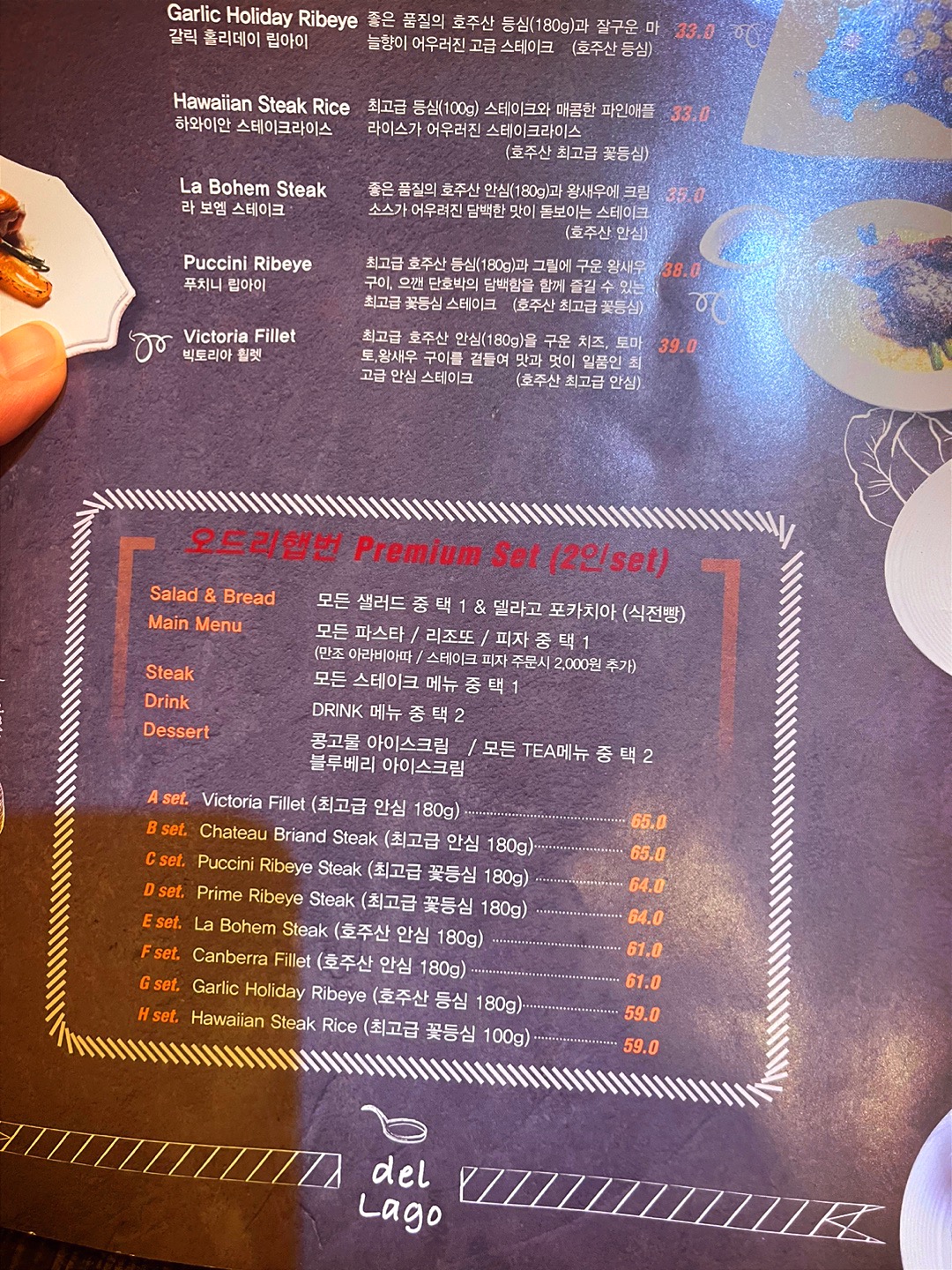 저는 피자를 좋아하는데, 남편이 앉아서 메뉴 보자마자 “오늘 피자는 먹지 맙시다” 늘 피자를 남기니까, 저혼자 다먹을 수가 없으니까 남겼는데 델라고 피자도 못먹고 가다니… 대신 스테이크를 선택했습니다.