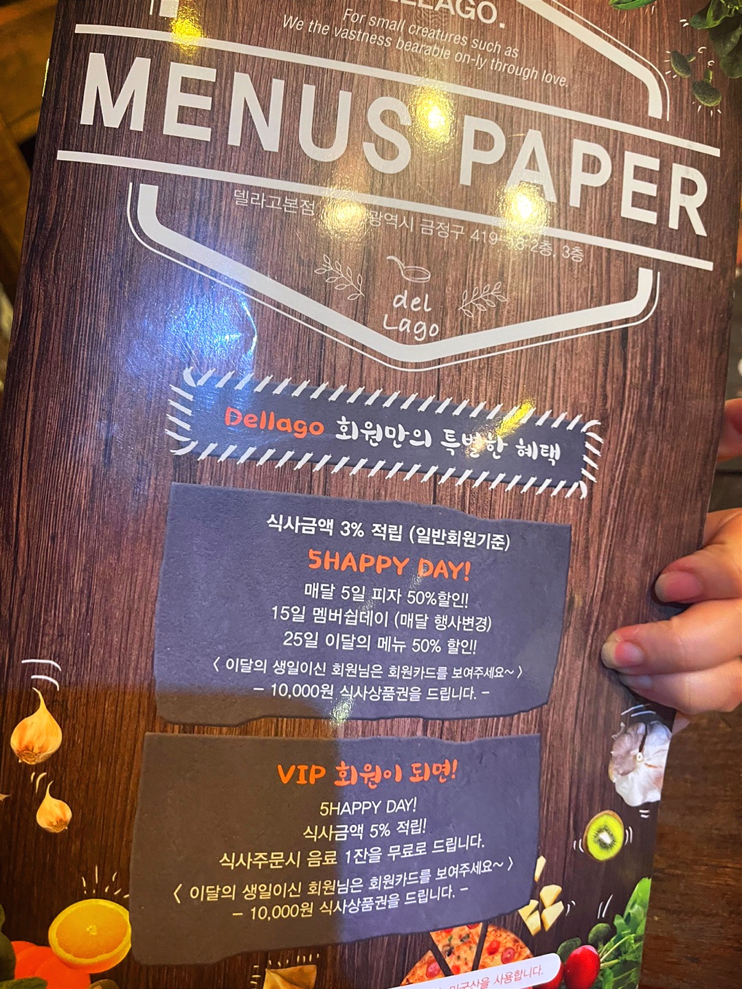 델라고 회원특전 : 일반회원 3% 적립, VIP회원 5% 적립( 식사시 음료1잔 무료)