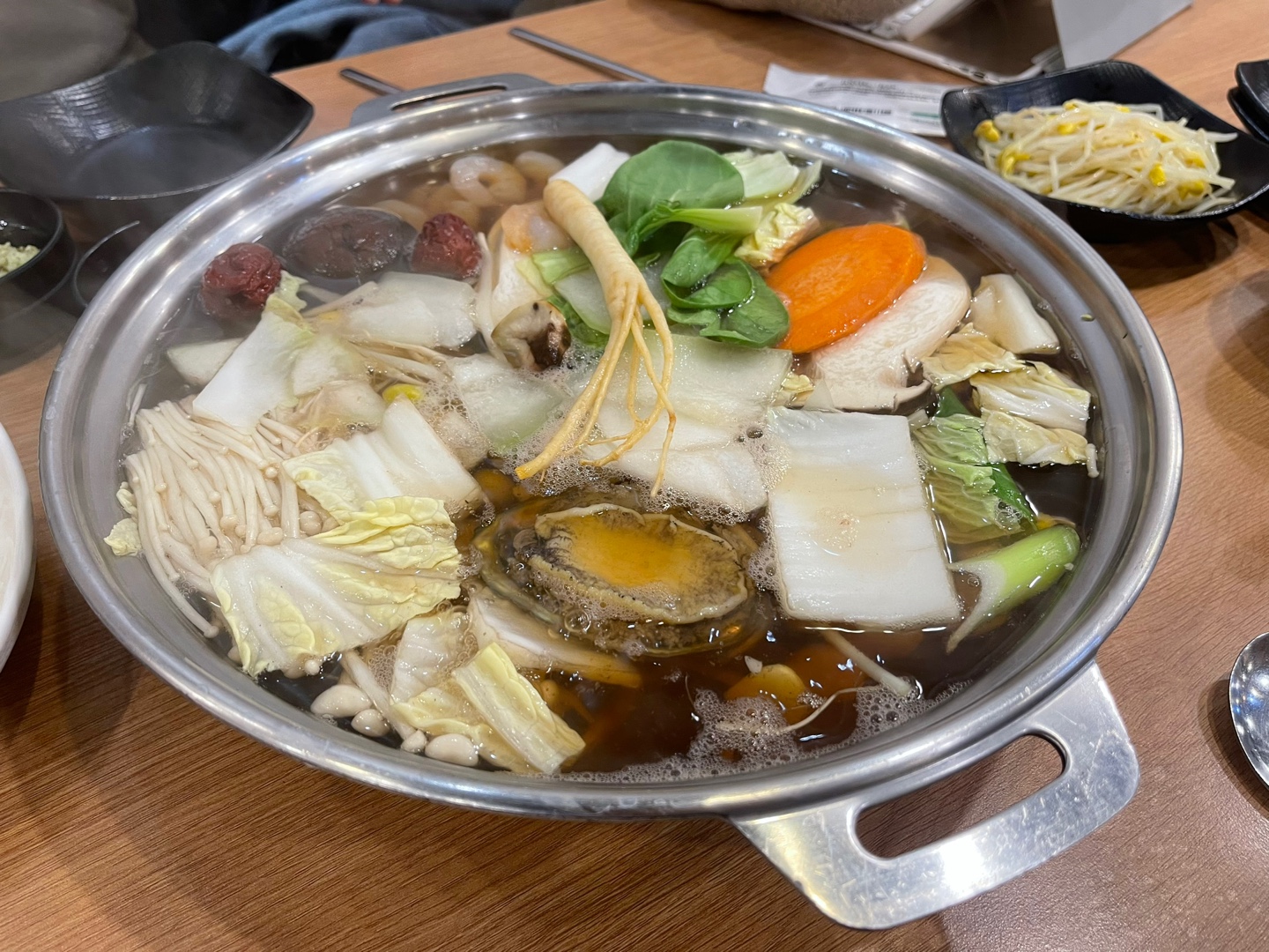 전복이랑 삼이랑 몸에 좋은것들 잔뜩 넣어서 바글바글 끓여서 먹입니다.