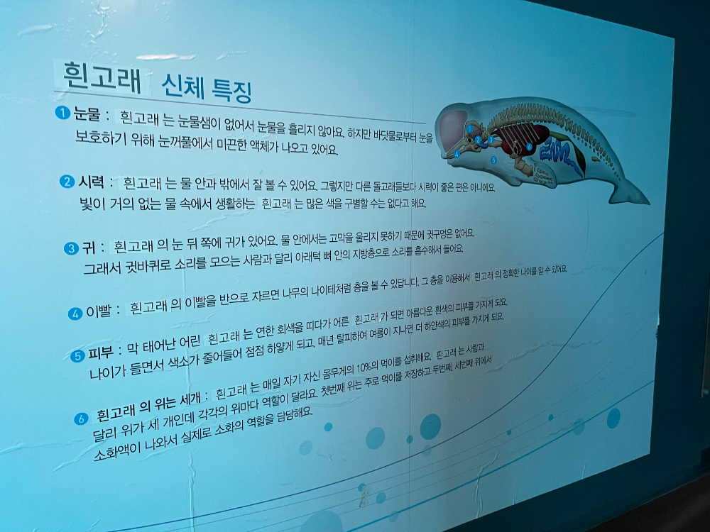 -흰고래의 위 3개 : 매일 자기 몸무게의 10% 먹음, 첫번째위 먹이저장, 두번째 세번째에서 소화액이 나와서 소화시킴.