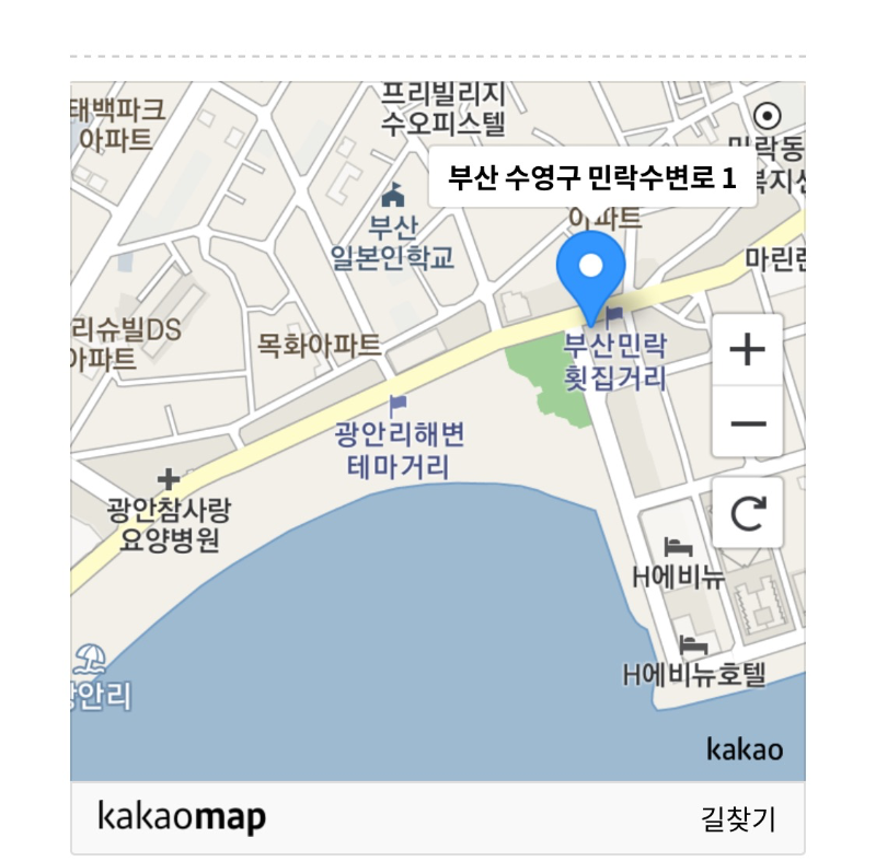 - 버 스 : 41,49,38,42,51,62,83,83-1,108-1번 광안리해수욕장 정류장 하차 후 도보로 약 3분 이동