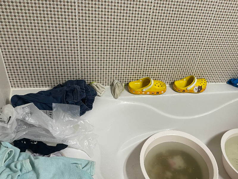 4. 아이들 샤워시킬때도 큰 대야에 서게하고 모래를 헹구어내시고, 충분히 씻기세요. 머리밑에도 모래가 있습니다. 주의주의