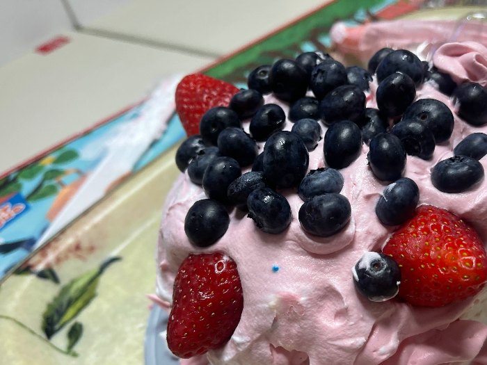 역시 과일을 슬라이스로 잘라서 사이사이에 묻혀줄걸 그랬어요. 데코하고보니 핑크생크림이 남았죠