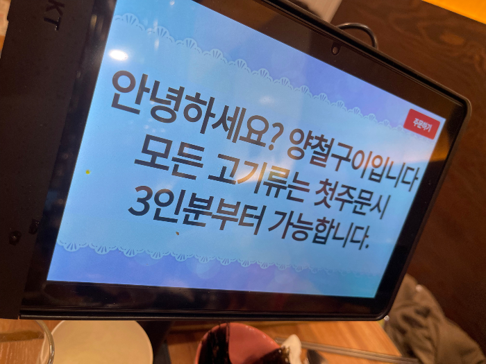 첫주문이 3인분부터인것을 몰랐네요. 태블릿 주문으로 바뀌었음을 확인하고 놀랐는데, 3인분부터라고 탭에 떠있었습니다.