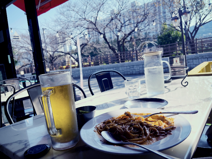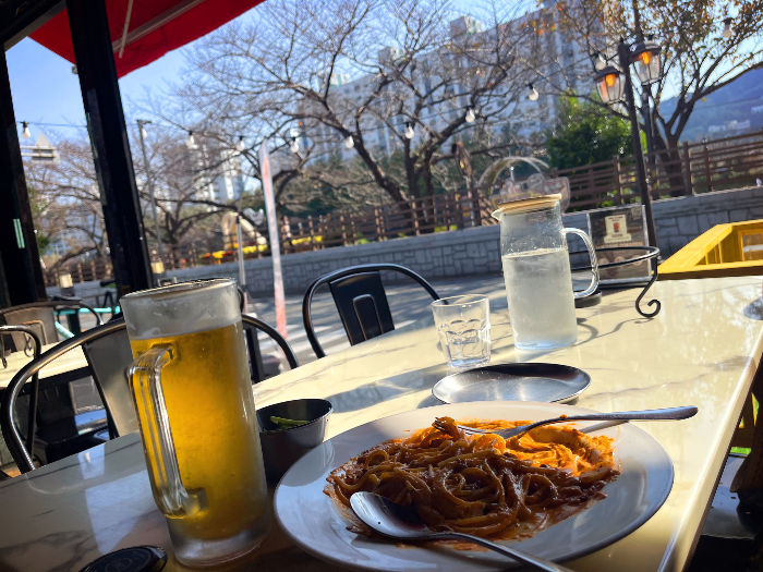 온천천 카페거리를 가면 뭔가 늘 봄기운의 벚꽃이있었고, 열심히 운동하는 사람들 가운데서 함께 걸으며 저 또한 관리하는 느낌이라 기분좋게 걷는 코스입니다. 그리고 아주 가끔 온천천 카페거리의 많은 가게중에서 골라서 맥주한잔정도 하면 그역시 소소한 행복이라고나 할까요~^^ 낮에 여럿이서가면 식사하고 티타임 정도 가지지만, 모여서 낮부터 술마시는 사람들은 드물죠. 홍홍