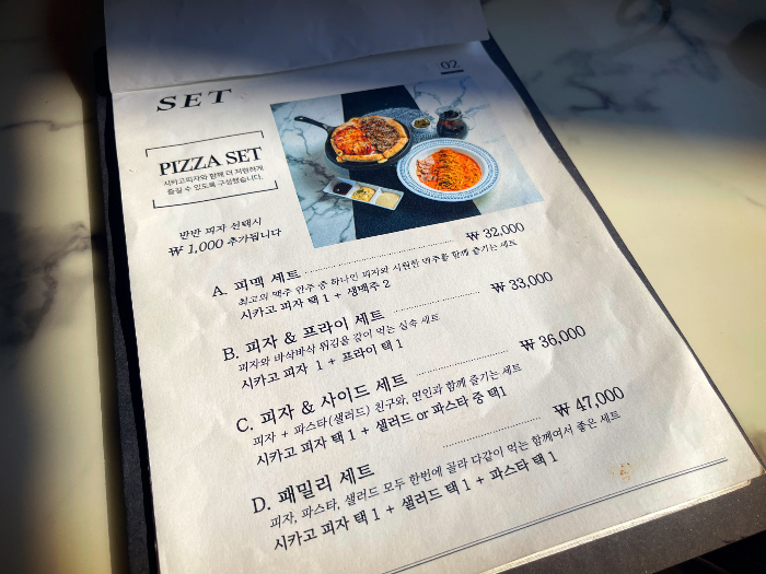 메뉴 : 시카고피자 25000, 세트메뉴 32000, 파스타샐러드 11000, 사이드 스낵 9000