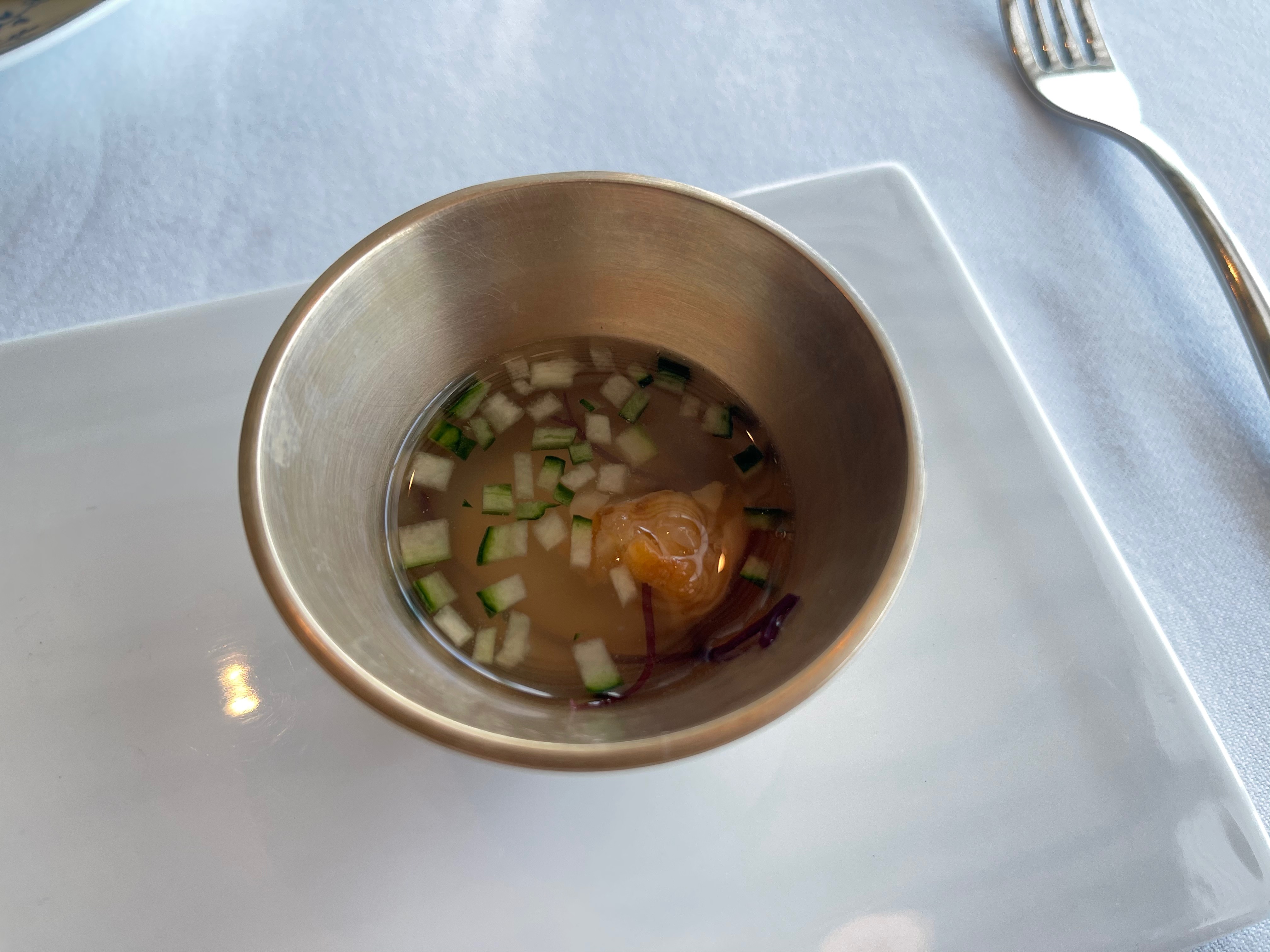 오이와 토마토로 만든 콘소메와 멍게