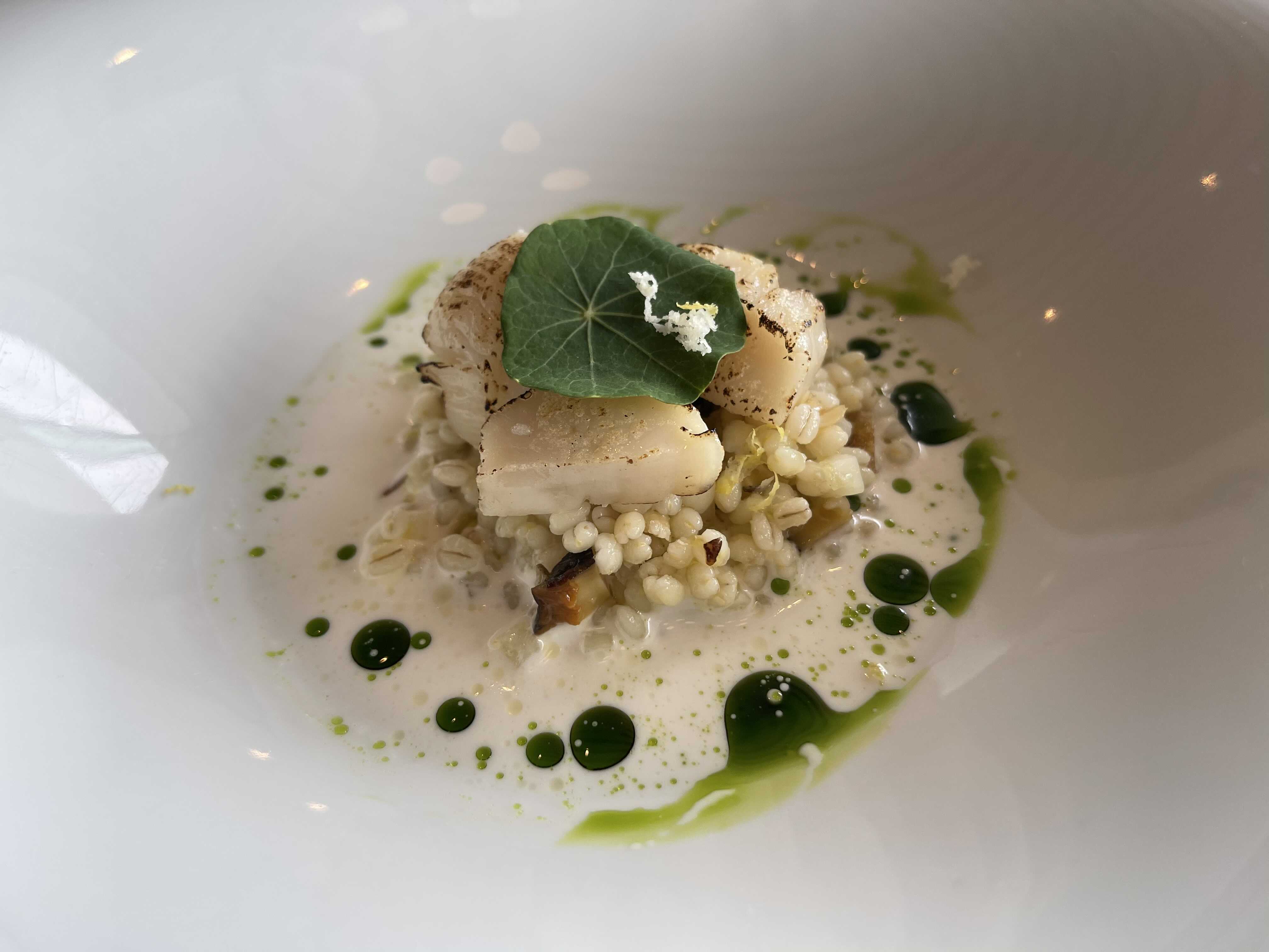 가리비 관자 참소라 보리 홀스레디쉬크림 허브오일