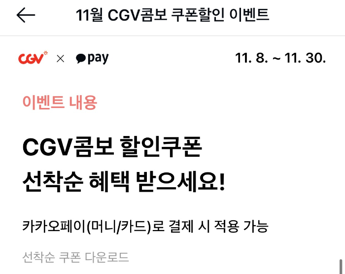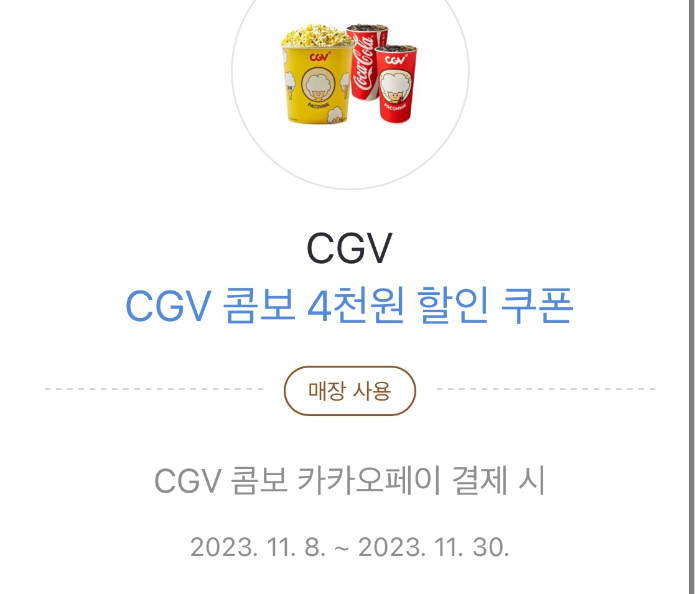 아래 링크로 카카오페이에서 cgv콤보 쿠폰 다운받아서 쓰면 됩니다.