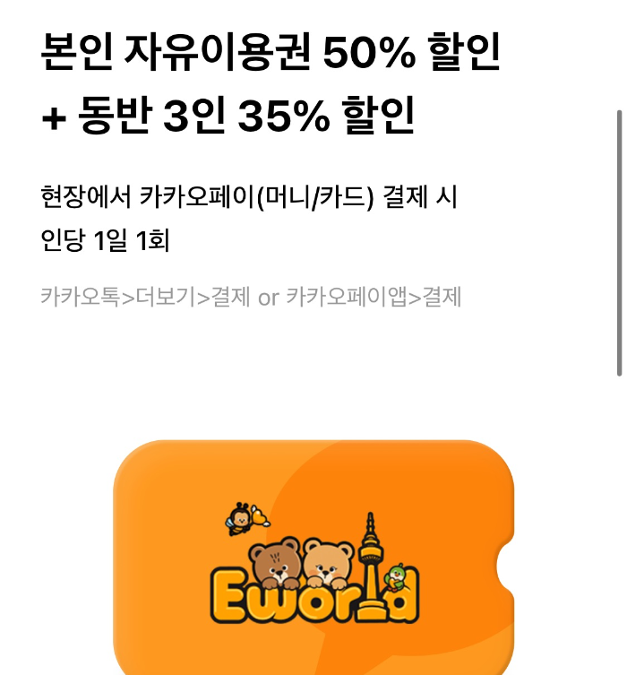 대구 이월드 자유이용권 50%할인받기 : 신용카드할인이 아니라 카카오페이 결제 본인반값 동반인 35% 3명까지 할인된다고해요