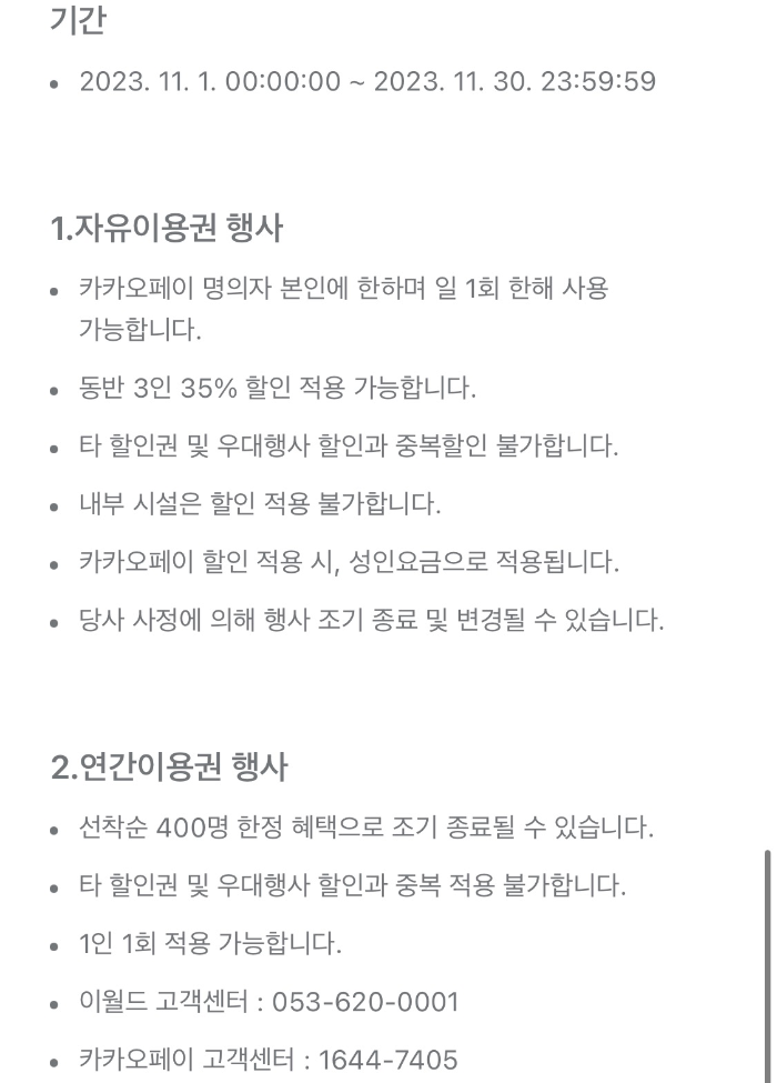 • 카카오페이 명의자 본인에 한하며 일 1회 한해 사용 : 대구이월드 반값