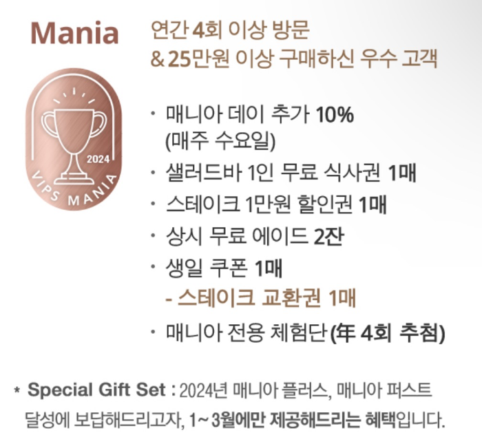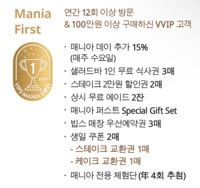 Mania First - 연간 12회 이상 방문 & 100만원 이상 구매하신 VVIP 고객 매니아 데이 추가 15% (매주 수요일) 샐러드바 1인 무료 식사권 3매 스테이크 2만원 할인권 2매 상시 무료 에이드 2잔 매니아 퍼스트