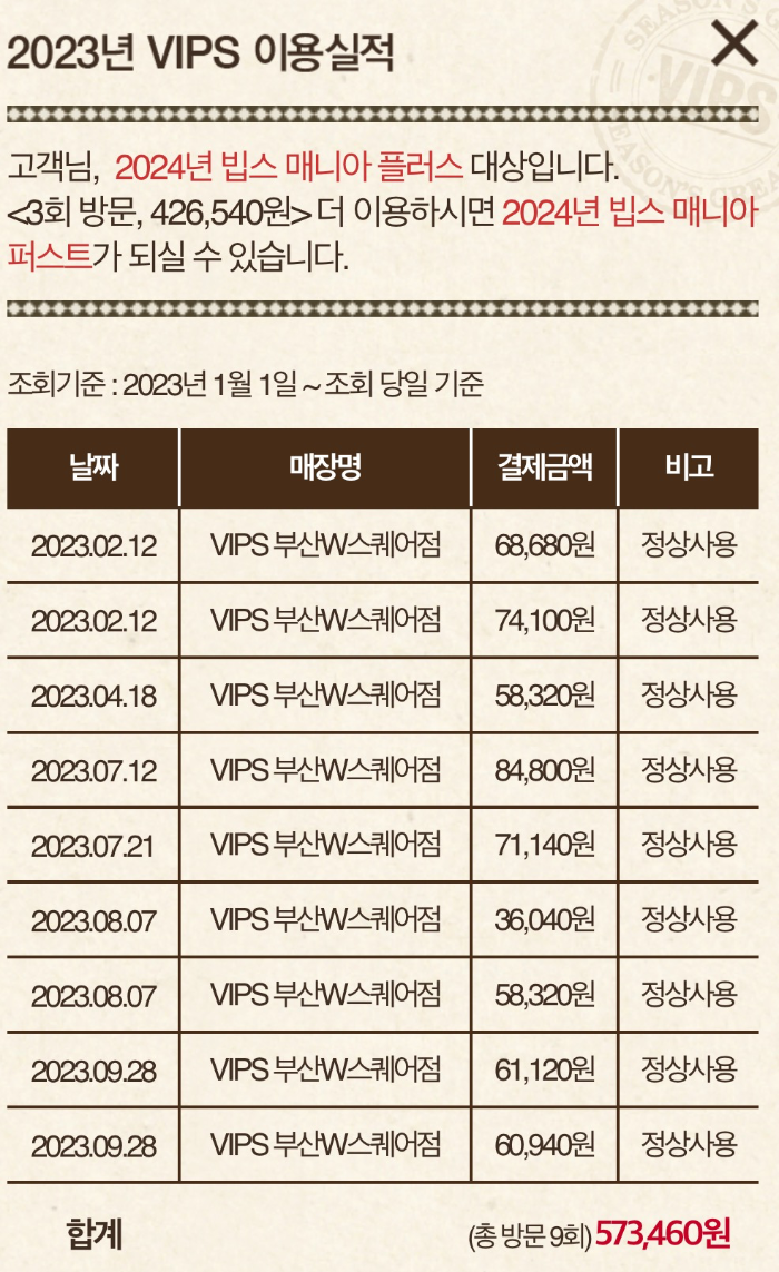 빕스 할인을 잘받는 법을 터득한 이후로 빕스를 종종 갔더니 9월까지의 누적이 50만원을 넘어서 2024년 빕스 매니아 확정~~~!!
