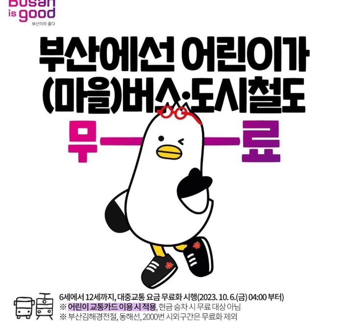 2023년 10월 6일 금요일 04시부터 6세~12세까지 부산 대중교통 요금 무료입니다. 부산어린이지하철무료, 부산어린이버스무료