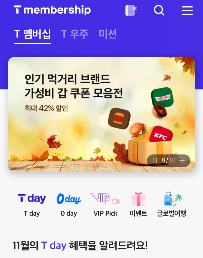 대체 어디에서 찾냐고 물어보신다면 티멤버쉽 어플 들어가서 가운데 떠있는것을 옆으로 밀어보면,
