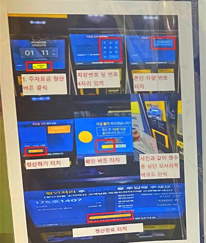 외래: 주차장 왼쪽상단의 바코드를 사전정산 기기에 인식시킵니다.