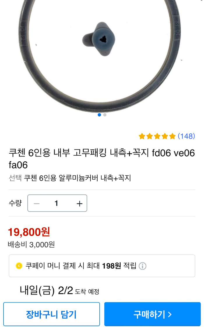 쿠첸 서비스센터 쿠첸압력밥솥 6인용 클린커버 패킹 + 손잡이 꼭지 구매 : 6000원