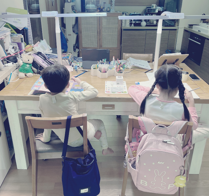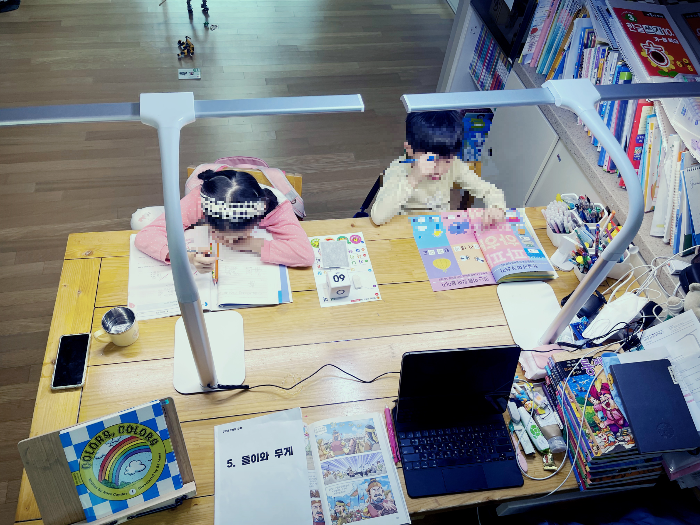 어리지만 두아이가 매일 한시간이상 거실책상에 앉아서 자기 공부하는 습관을 가지고 있는 우리집 :6인용 식탁을 3인 책상으로 사용중