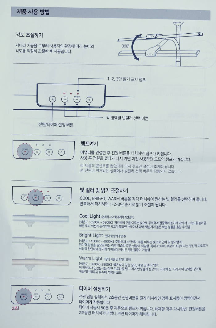 점등된 상태에서 전원버튼 2초간 길게 터치하면50분 타이머가 설정됩니다. 쉬었다가 공부하라고요 ^^