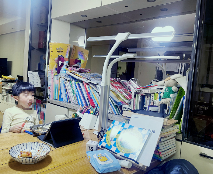 1 넓고 균일한 빛 분포 : 6인식탁에 두개를 켜서 둘을 앉혔더니 딱 좋은 면학분위기 조성. 작은 스탠드는 그 책만 눈부시게 비추지만, 큰 스탠드가 그림자 없이 비추어줌.