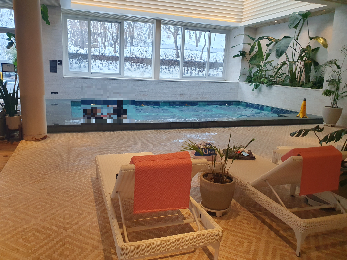 숲에 둘러싸인 실내수영장과 노천탕이 있는