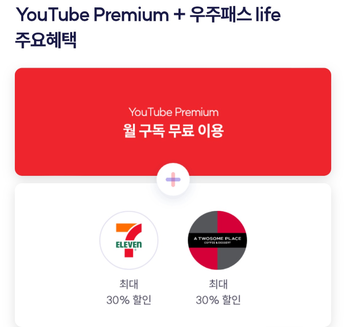 2 우주패스 life = 유튜브프리미엄 + 세븐일레븐편의점30%할인+ 투썸 30프로할인