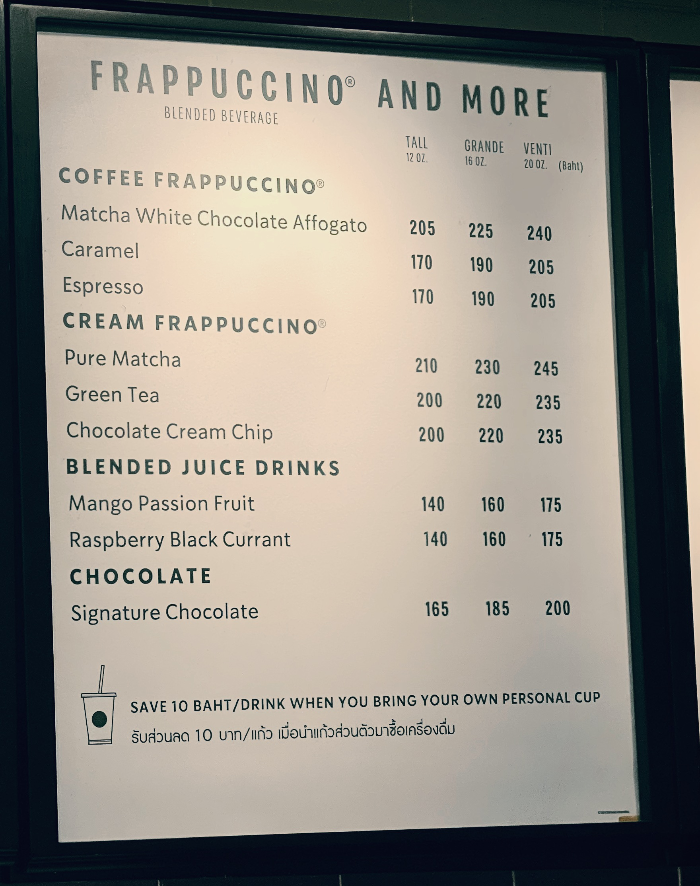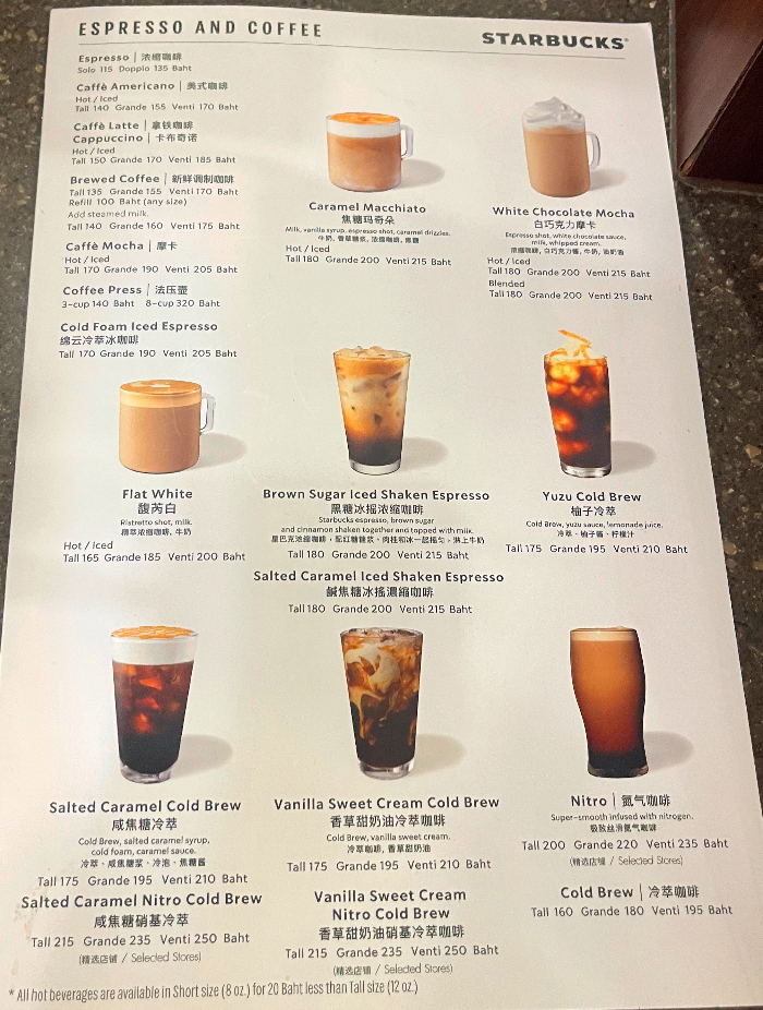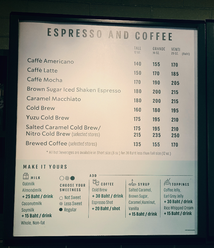 -태국 스타벅스 전 메뉴 및 가격 (톨사이즈 기준)