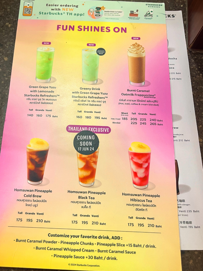 태국 스타벅스 전 메뉴 및 가격 (톨사이즈 기준)