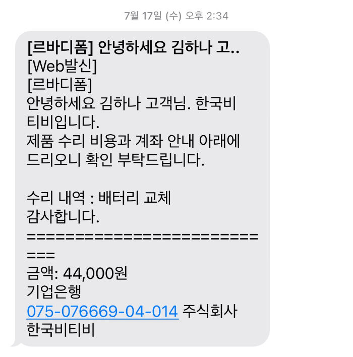 제품 수리 비용과 계좌 안내 아래에 드리오니 확인 부탁드립니다.